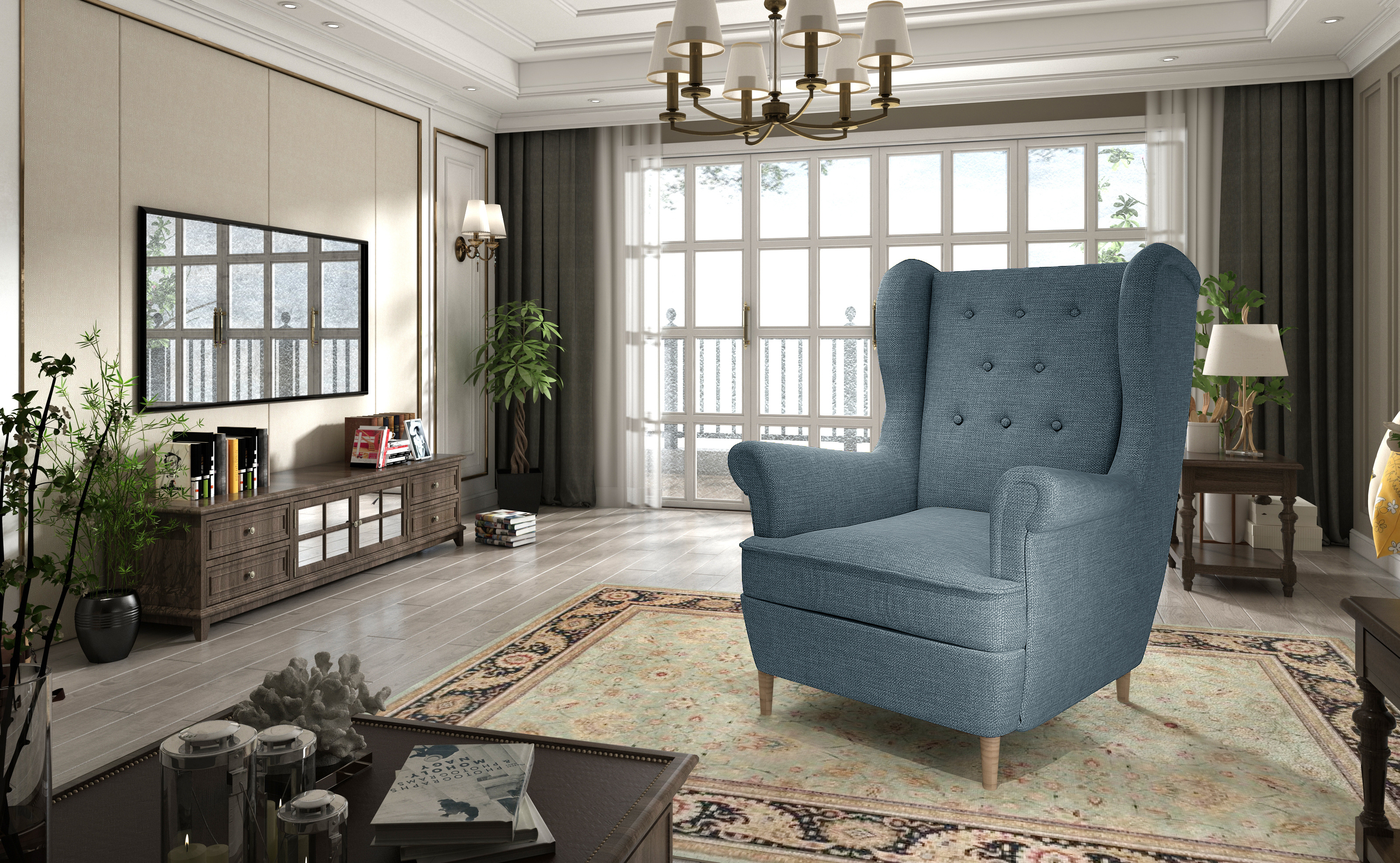 Křeslo Aros typu ušák je v barevném provedení Cover 70. Výplň sedadla je spojení odolné vlnité pružiny s měkkou flexibilní pěnou T30.