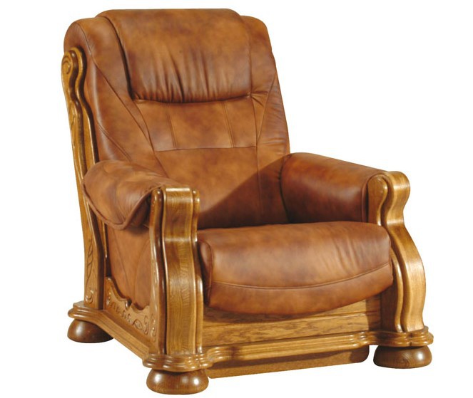 Moderní luxusní křeslo je vyrobeno z pravé hovězí kůže. Kostra je vyrobena z tvrdého dubového dřeva s pevnou konstrukcí. Na bocích tohoto křesla je ručně vyřezaný motiv. Výplň sedáku je vysoce kvalitní polyuretanová pěna s pružinou bonel. Možnost výběru barvy kůže a dřeva. ámi zvolenou variantu barvy kůže i dřeva (dle přiloženého vzorníku) uveďte do objednávky. Na obrázku kůže S-45, dřevo č.3.