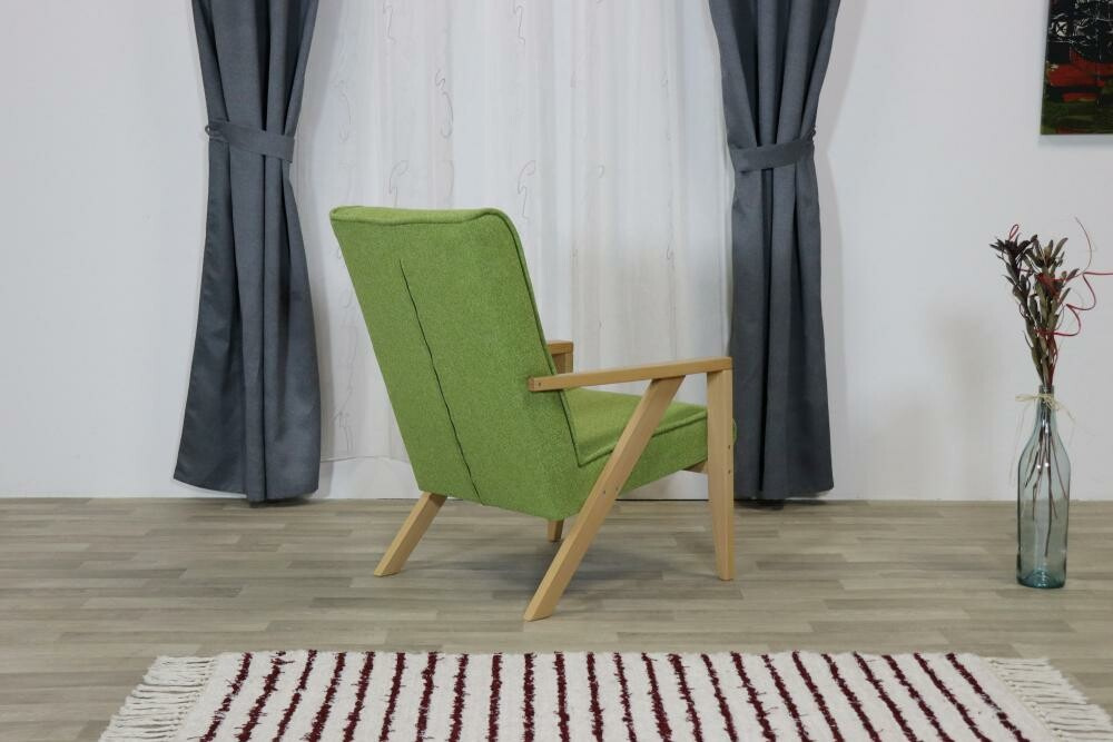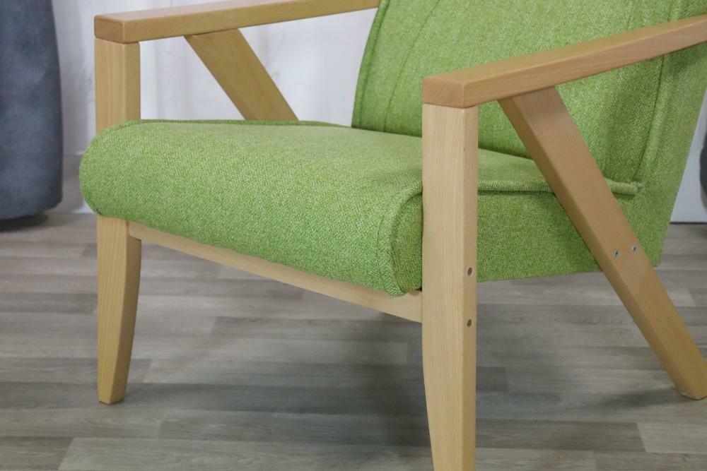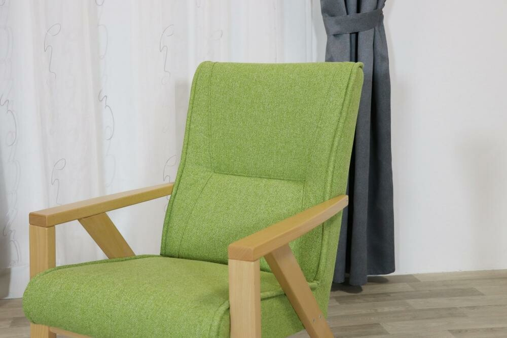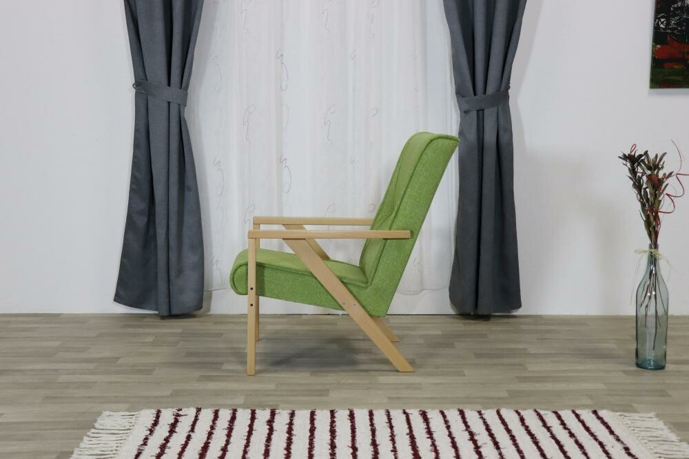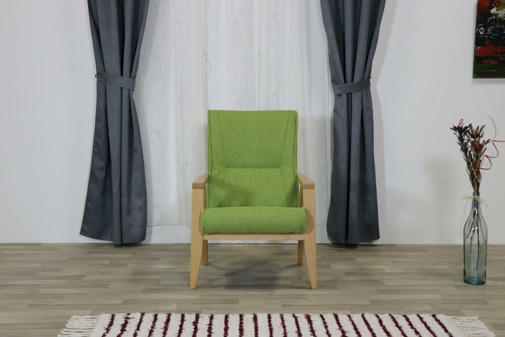 Lehké relaxační čalouněné křeslo Dominik s dřevěnou podnoží. Celá vnitřní kostra je vyrobena z masivu. Sedadlo je tvořeno základem z plochých pružin (vlnovce), doplněné o komfortní PUR pěnu. Opěradlo je z komfortní PUR pěny. Područky a nohy jsou vyrobeny z masivu (buk) tak, aby se o ně uživatel mohl vzepřít celou váhou těla.