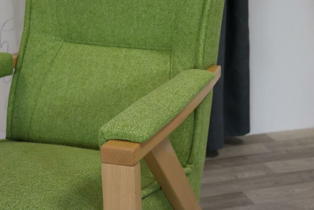 Lehké relaxační čalouněné  křeslo Dominik s dřevěnou podnoží. Celá vnitřní kostra je vyrobena z masivu. Sedadlo je tvořeno základem z plochých pružin (vlnovce), doplněné o komfortní PUR pěnu. Opěradlo je z komfortní PUR pěny. Područky a nohy jsou vyrobeny z masivu (buk) tak, aby se o ně uživatel mohl vzepřít celou váhou těla. Součástí jsou čalouněné područky.