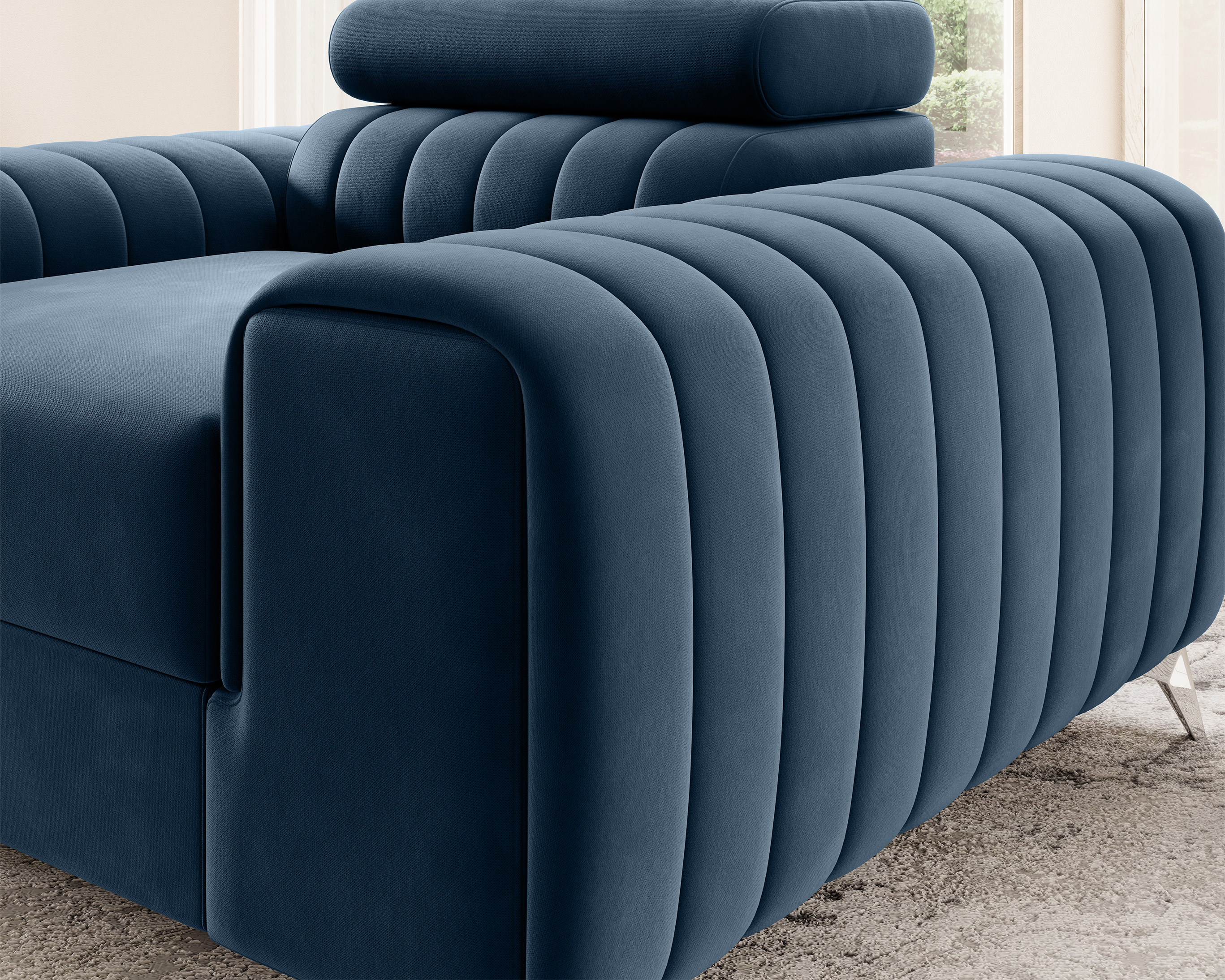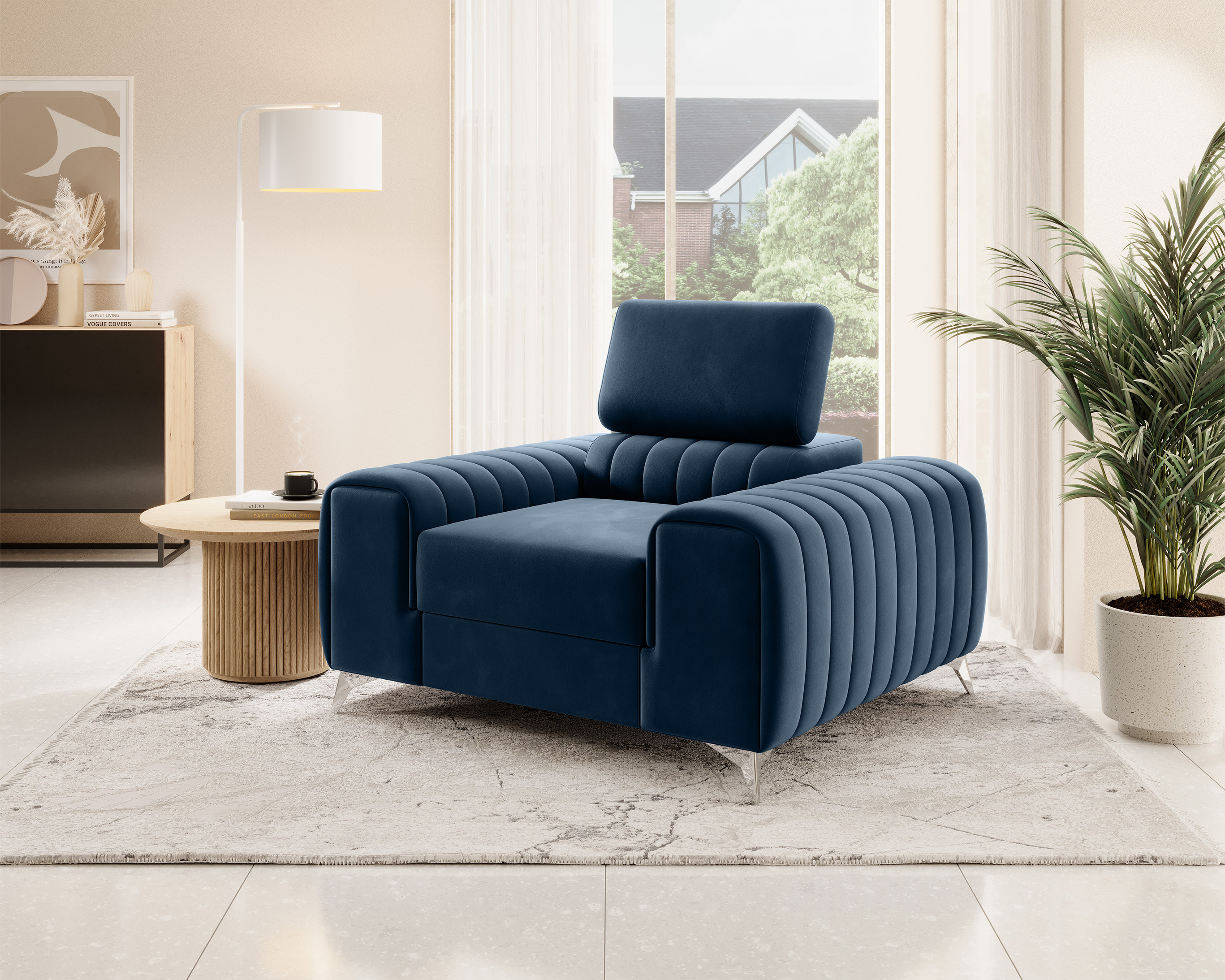 Křeslo Laurance v dezénu Lukso 40 má sedák tvořený polyuretanovou pěnou T30, HR pěnou a vlnovou pružinou typu B. Opěradlo křesla jsou vyplněné pěnou T2540. Potahová látka LUKSO: pevná látka, snadná údržba, nevybledne, bez stínového efektu po přejetí rukou. Křeslo má polohovatelnou opěrku hlavy a čalouněná záda. Nohy z pochromované oceli ve stříbrné barvě jsou 9 cm vysoké.