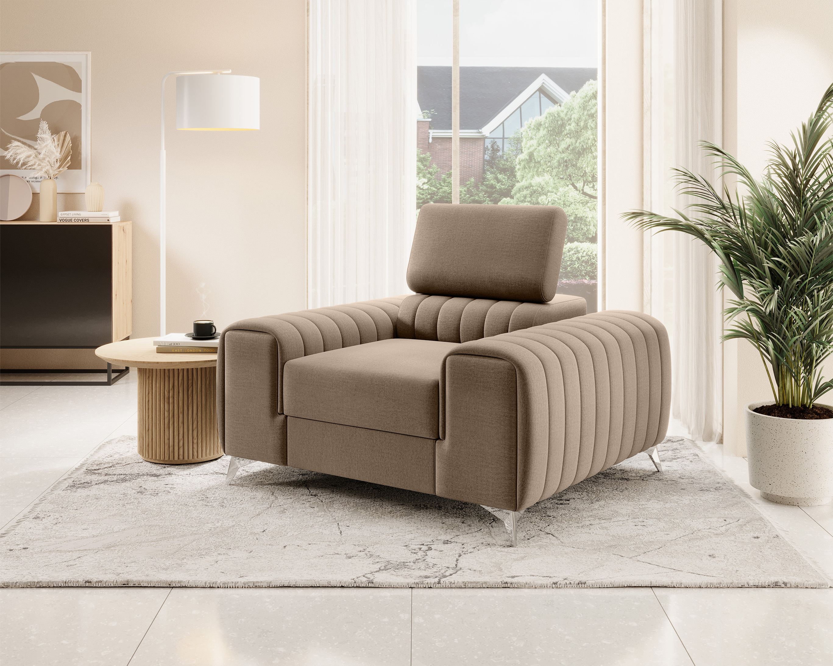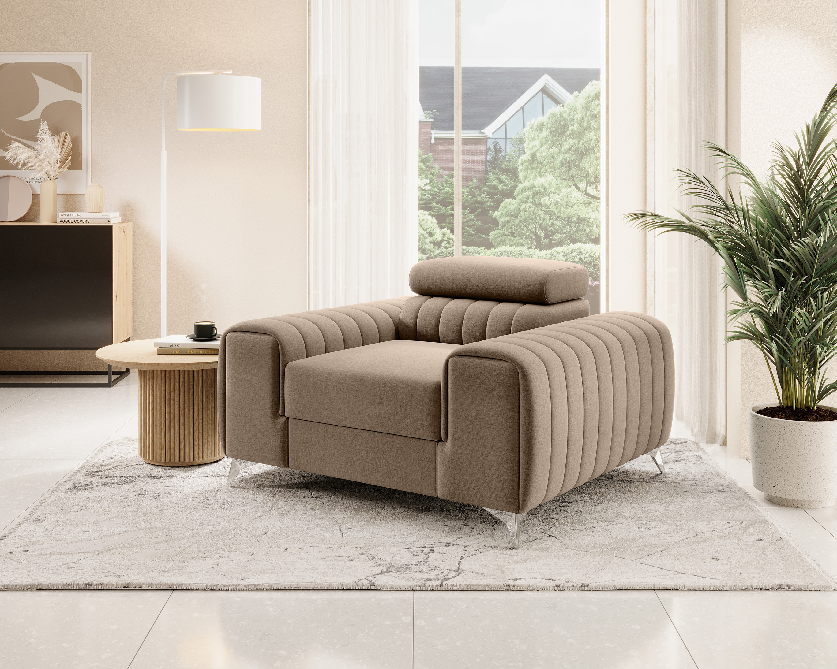 Křeslo Laurance v dezénu Nube 20 má sedák tvořený polyuretanovou pěnou T30, HR pěnou a vlnovou pružinou typu B. Opěradlo křesla jsou vyplněné pěnou T2540. Potahová látka NUBE: odolná a pevná, hladký povrch s odleskem, voděodolná. Křeslo má polohovatelnou opěrku hlavy a čalouněná záda. Nohy z pochromované oceli ve stříbrné barvě jsou 9 cm vysoké.