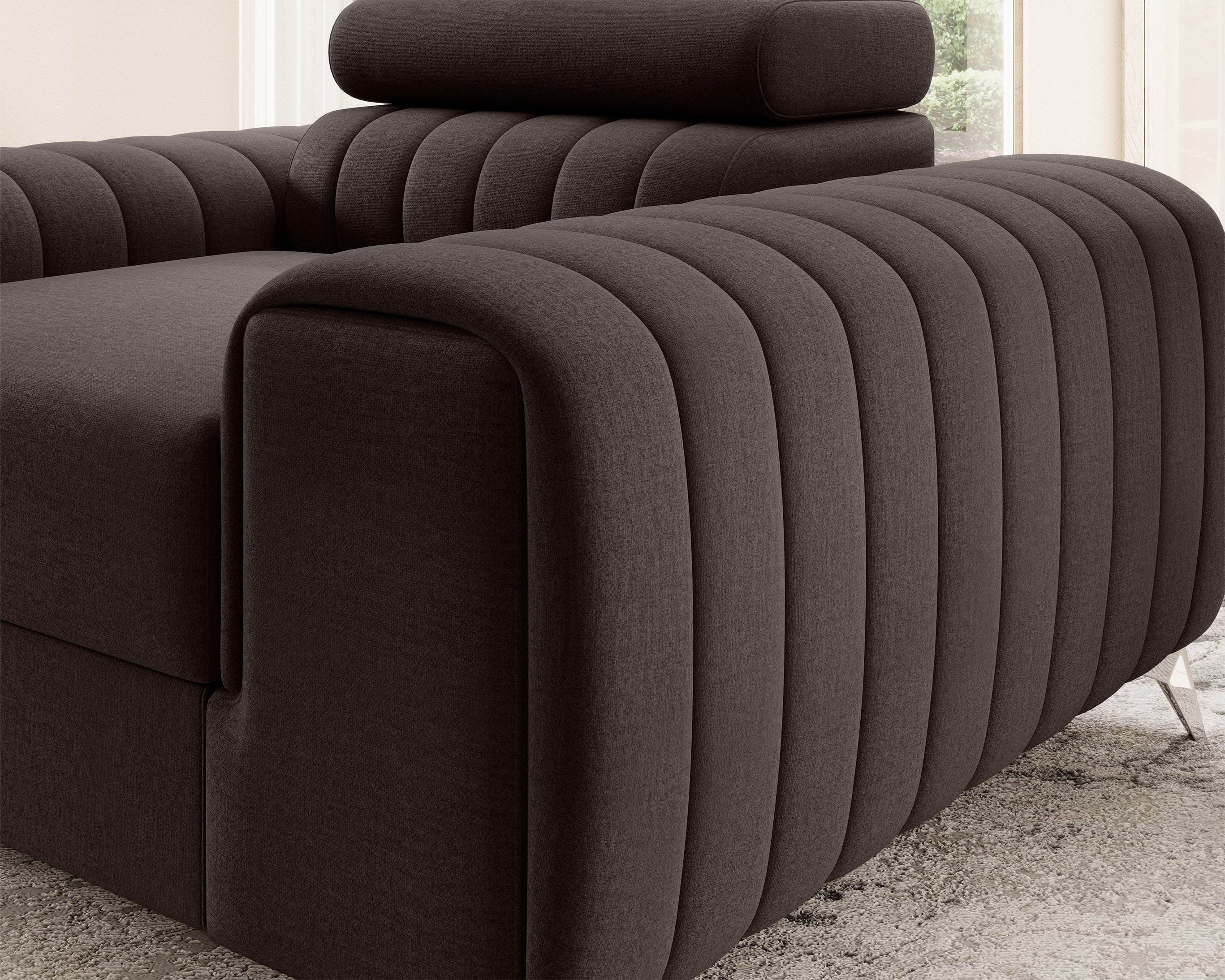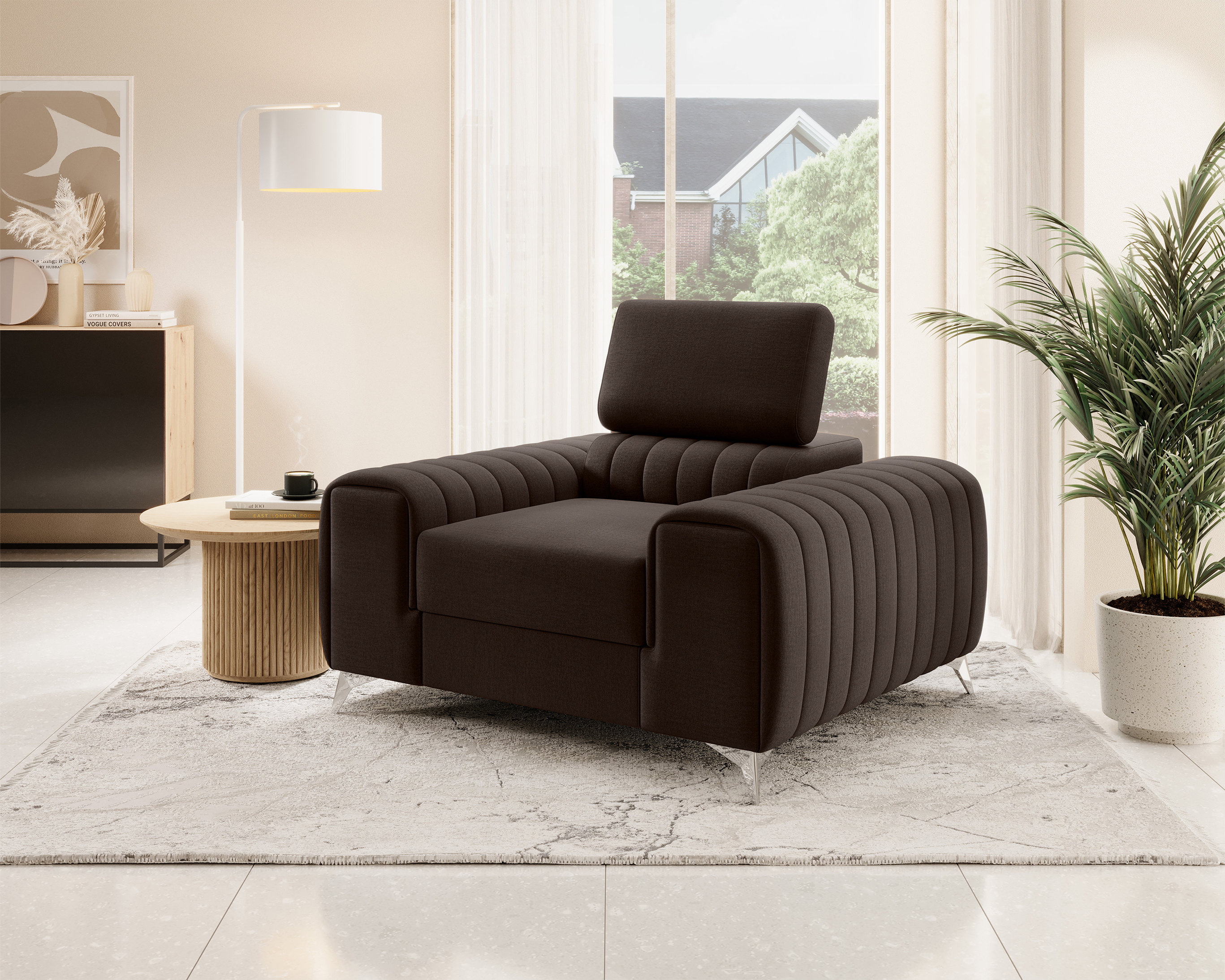 Křeslo Laurance v dezénu Nube 22 má sedák tvořený polyuretanovou pěnou T30, HR pěnou a vlnovou pružinou typu B. Opěradlo křesla jsou vyplněné pěnou T2540. Potahová látka NUBE: odolná a pevná, hladký povrch s odleskem, voděodolná. Křeslo má polohovatelnou opěrku hlavy a čalouněná záda. Nohy z pochromované oceli ve stříbrné barvě jsou 9 cm vysoké.