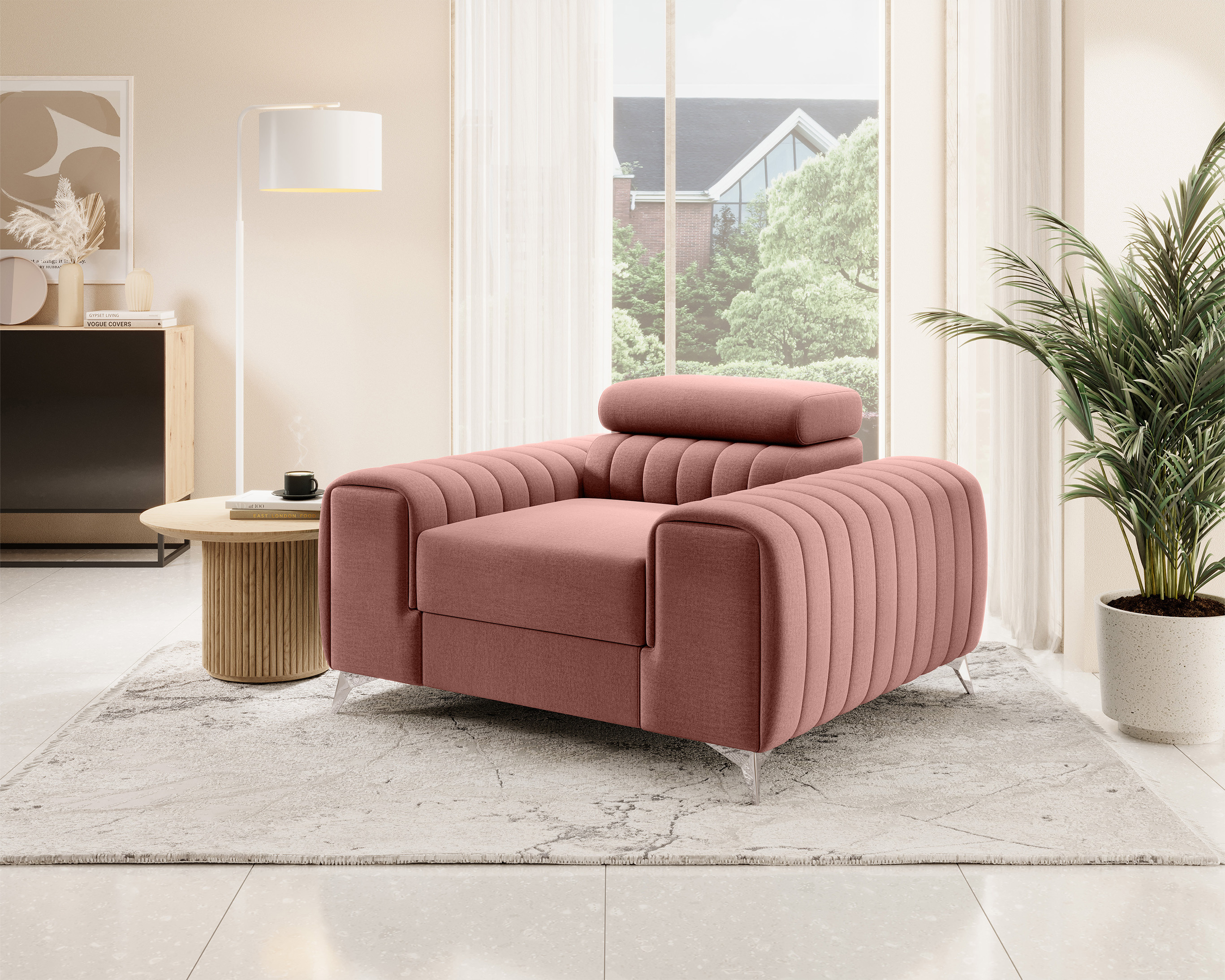 Křeslo Laurance v dezénu Nube 24má sedák tvořený polyuretanovou pěnou T30, HR pěnou a vlnovou pružinou typu B. Opěradlo křesla jsou vyplněné pěnou T2540. Potahová látka NUBE: odolná a pevná, hladký povrch s odleskem, voděodolná. Křeslo má polohovatelnou opěrku hlavy a čalouněná záda. Nohy z pochromované oceli ve stříbrné barvě jsou 9 cm vysoké.