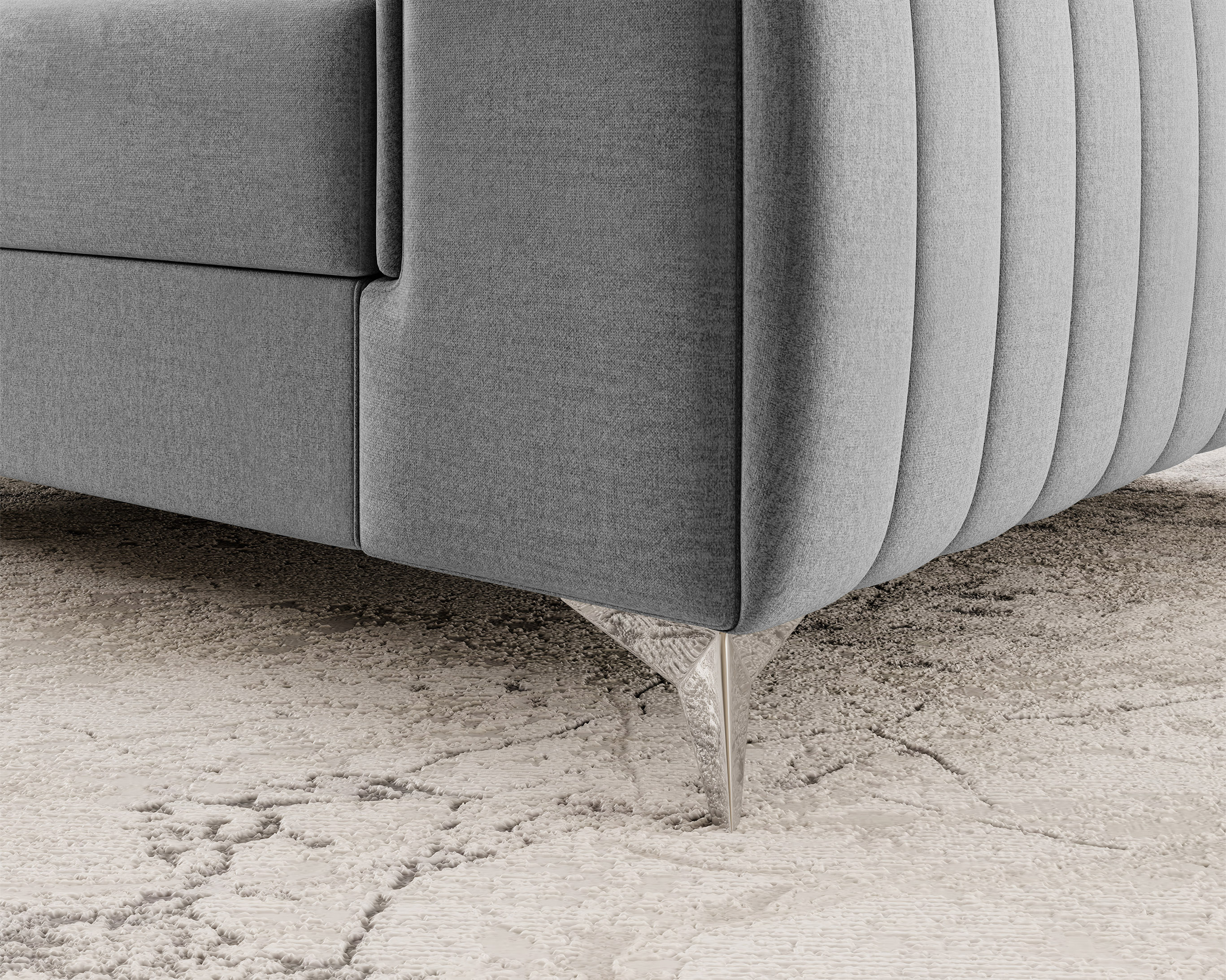 Křeslo Laurance v dezénu Nube 3 má sedák tvořený polyuretanovou pěnou T30, HR pěnou a vlnovou pružinou typu B. Opěradlo křesla jsou vyplněné pěnou T2540. Potahová látka NUBE: odolná a pevná, hladký povrch s odleskem, voděodolná. Křeslo má polohovatelnou opěrku hlavy a čalouněná záda. Nohy z pochromované oceli ve stříbrné barvě jsou 9 cm vysoké.