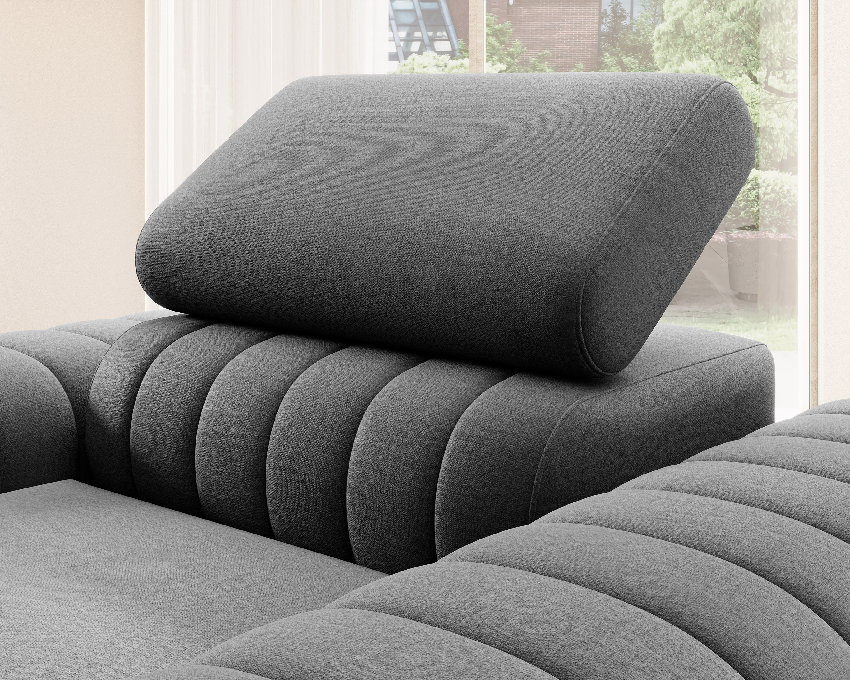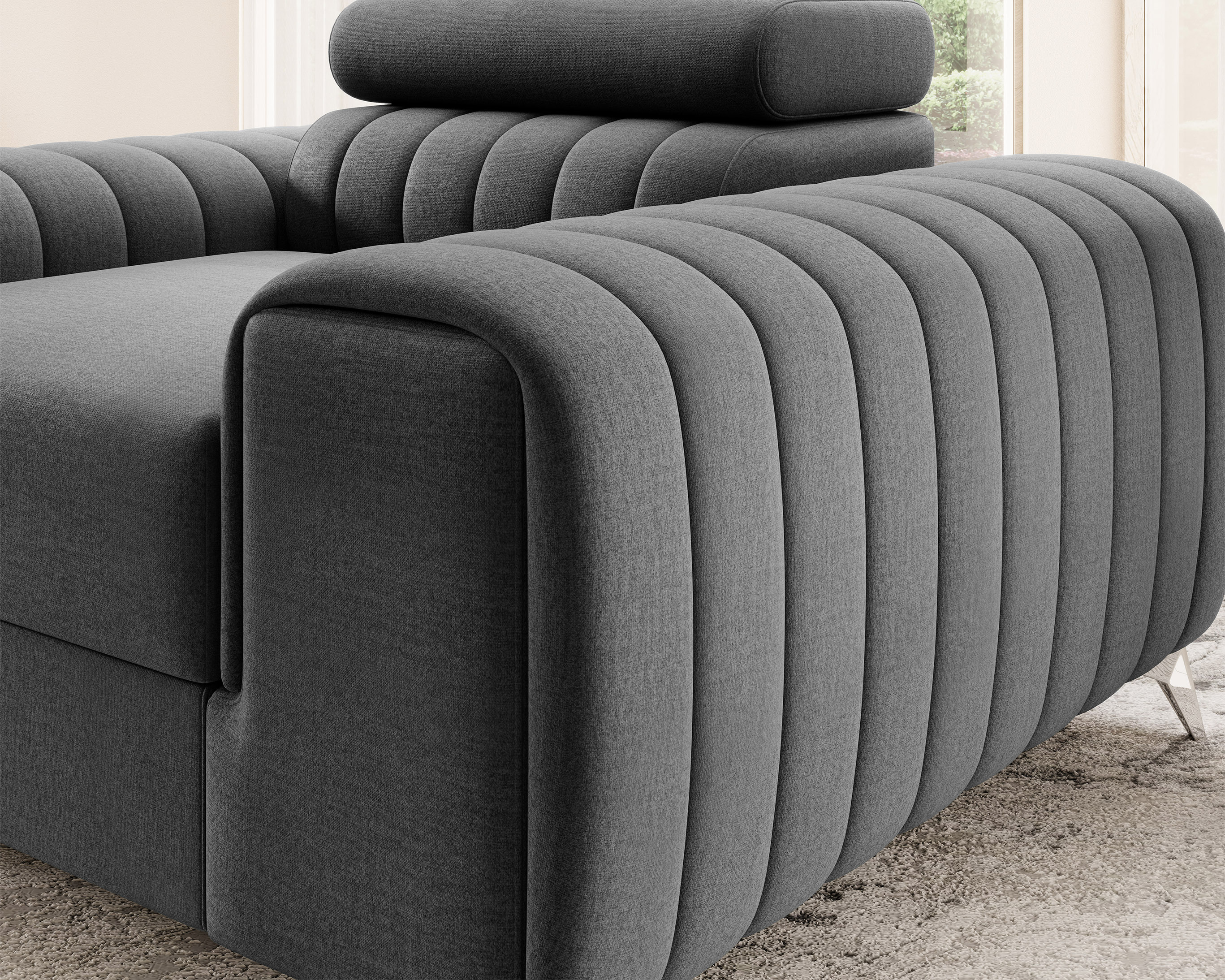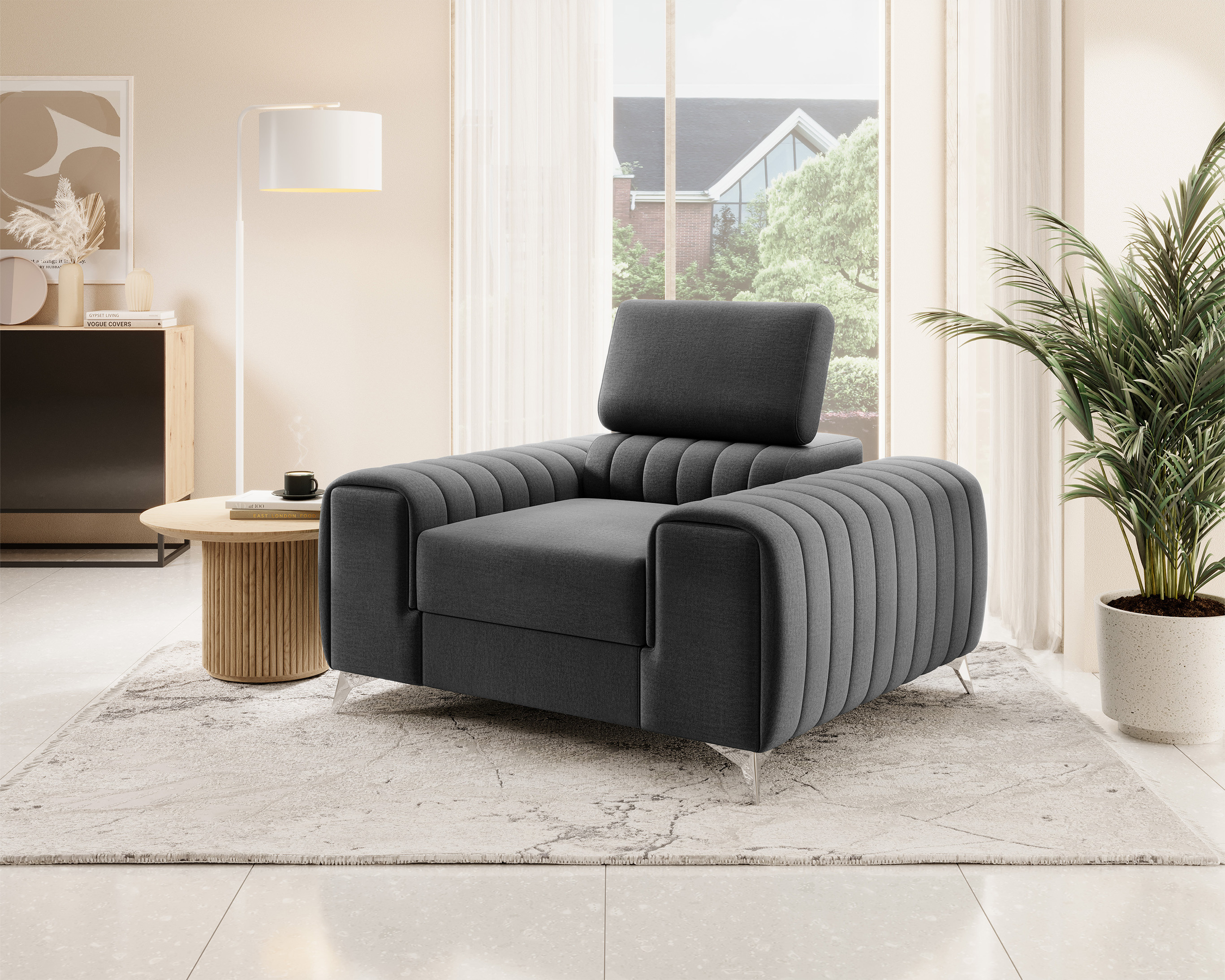 Křeslo Laurance v dezénu Nube 5 má sedák tvořený polyuretanovou pěnou T30, HR pěnou a vlnovou pružinou typu B. Opěradlo křesla jsou vyplněné pěnou T2540. Potahová látka NUBE: odolná a pevná, hladký povrch s odleskem, voděodolná. Křeslo má polohovatelnou opěrku hlavy a čalouněná záda. Nohy z pochromované oceli ve stříbrné barvě jsou 9 cm vysoké.