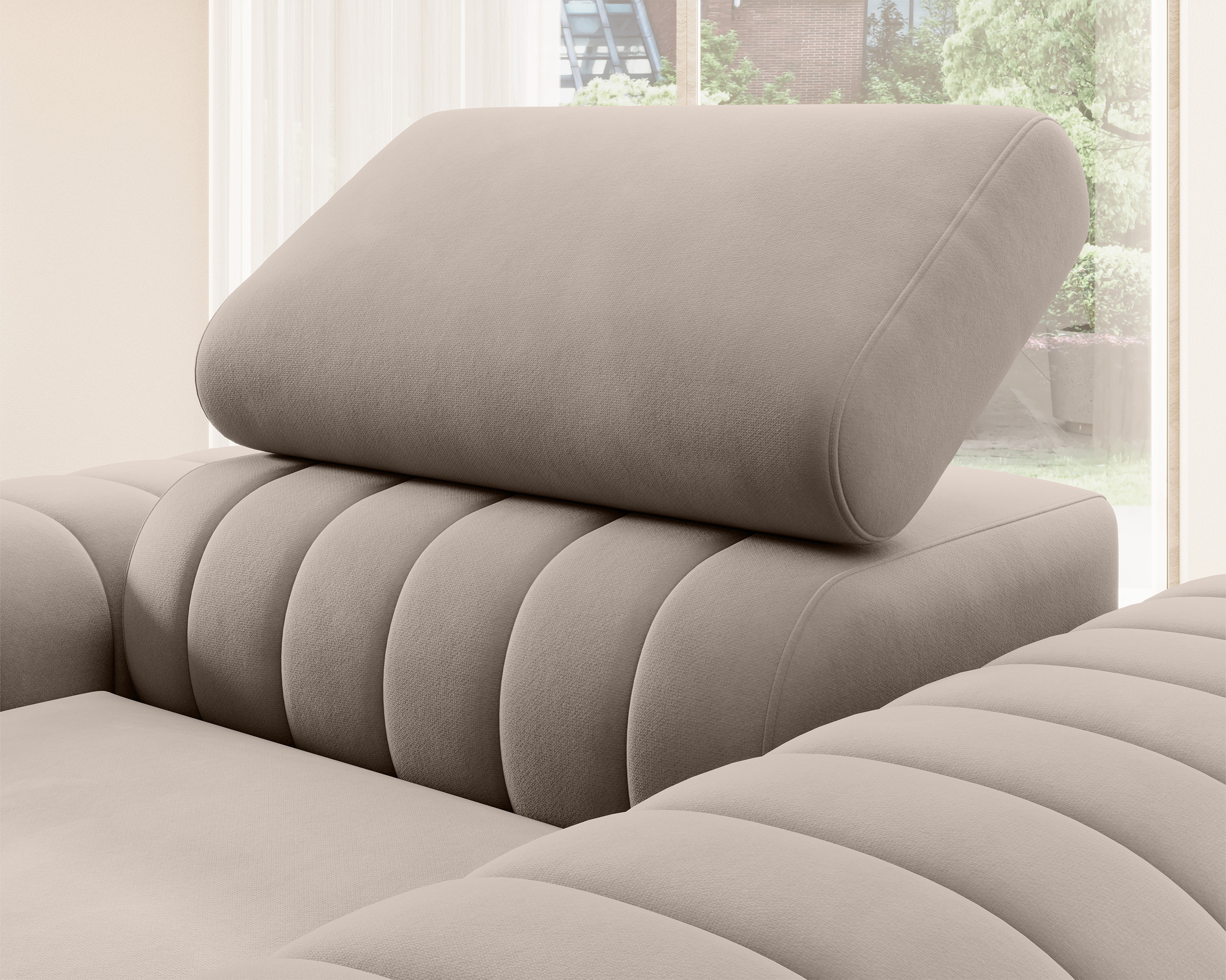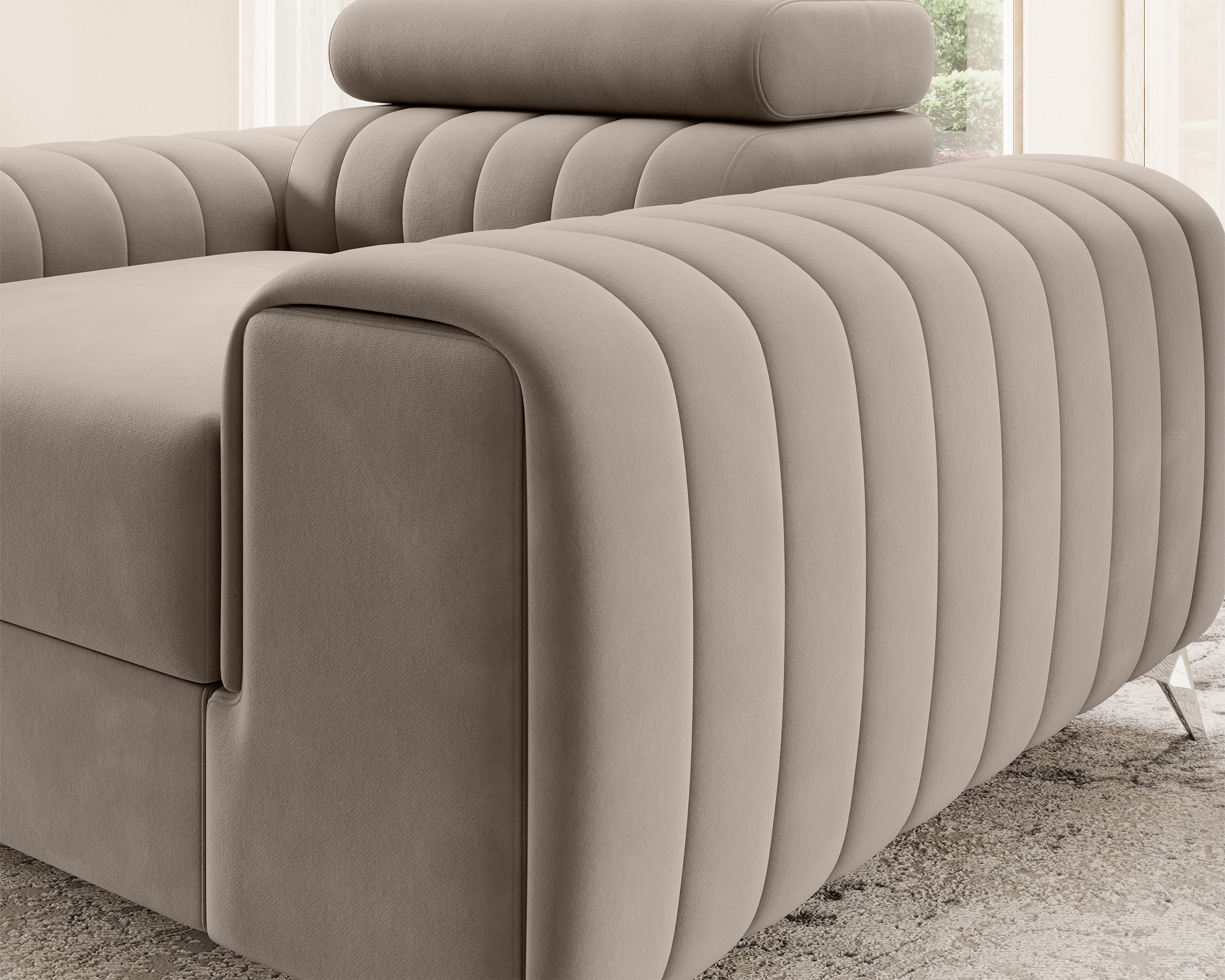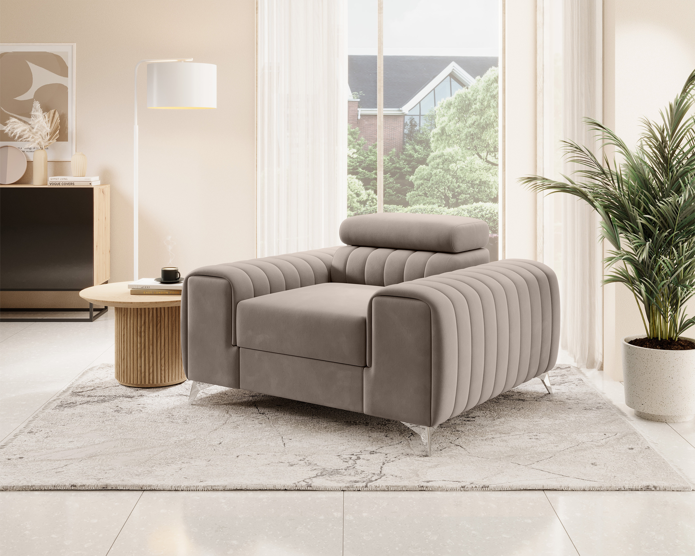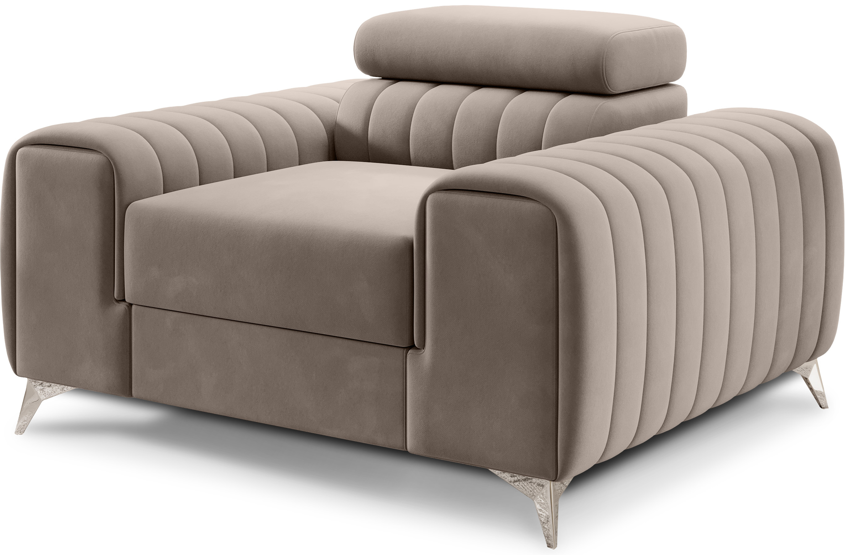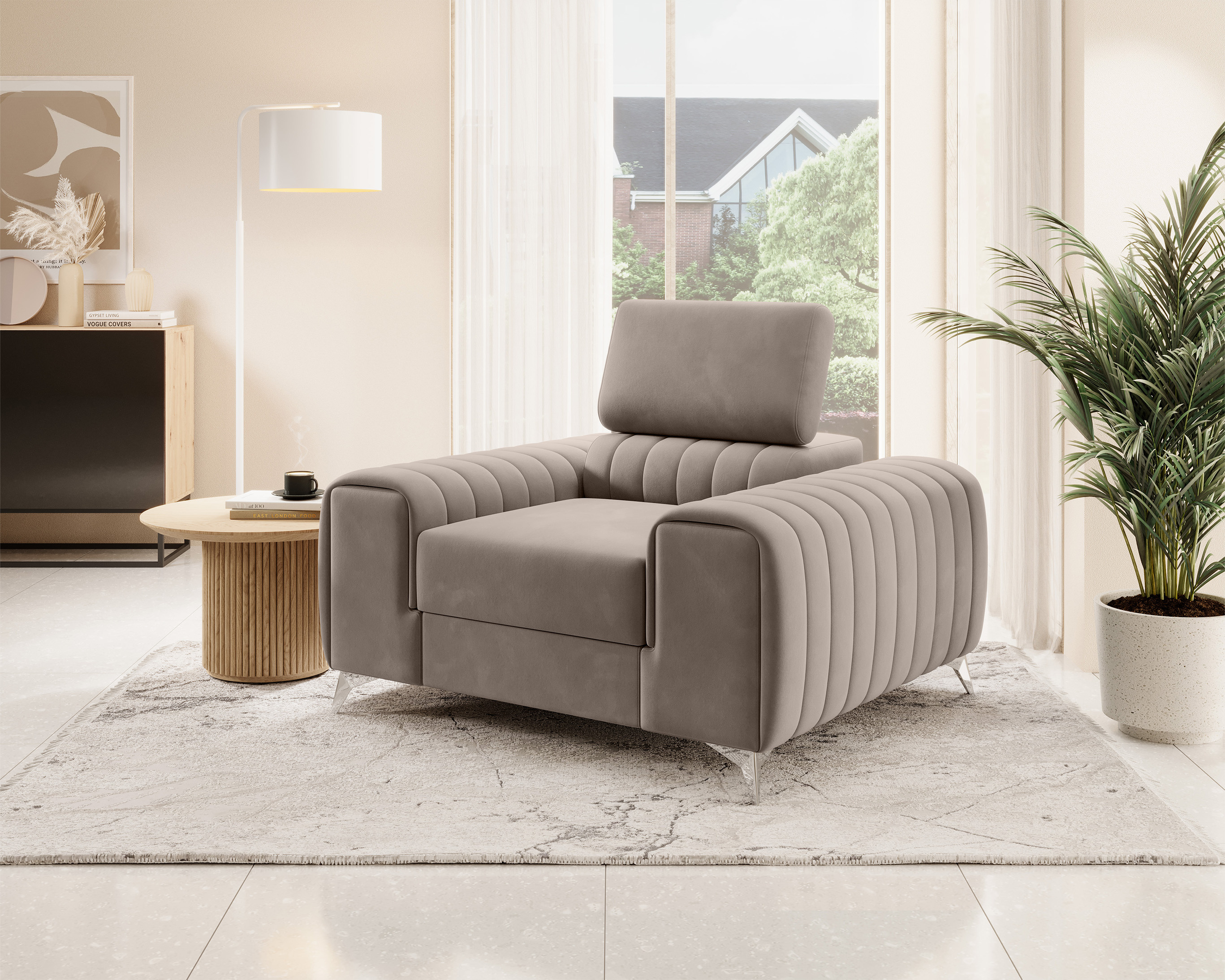 Křeslo Laurance v dezénu Sola 18 má sedák tvořený polyuretanovou pěnou T30, HR pěnou a vlnovou pružinou typu B. Opěradlo křesla jsou vyplněné pěnou T2540. Potahová látka SOLA: lesklý vzhled a jemná vazba, pevná a odolná proti oděru, nebledne bez stínového efektu po přejetí rukou. Křeslo má polohovatelnou opěrku hlavy a čalouněná záda. Nohy z pochromované oceli ve stříbrné barvě jsou 9 cm vysoké.