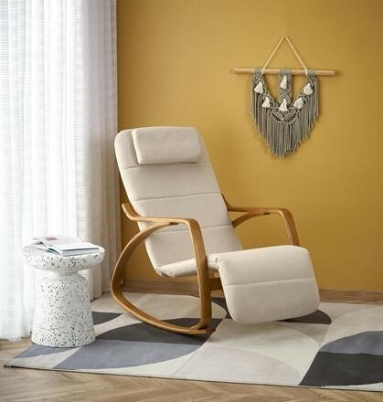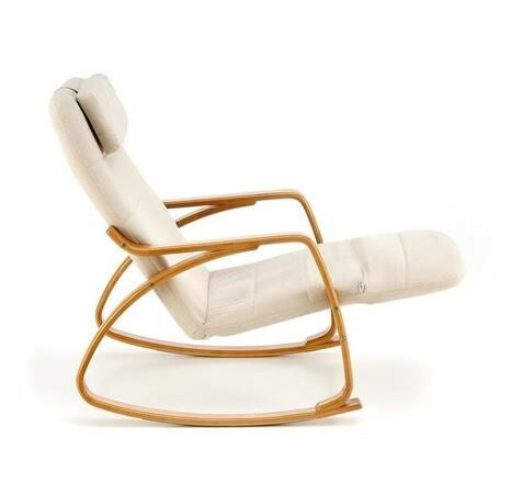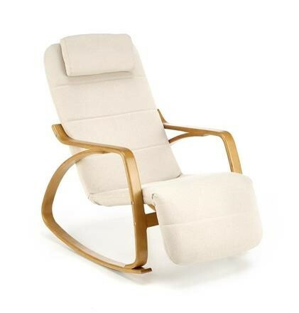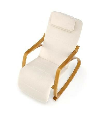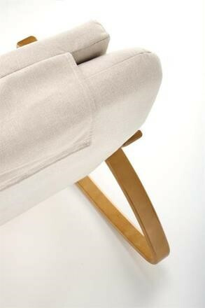 Křeslo Prime má rám z masivného dřeva, který vytváří dřevěné ližiny a dlouhé područky. Sedák z látky v béžovém provedení je vybaven přídavnou poduškou na podpěru hlavy. Díky dřeveným ližinám se můžete na křeslu pohupovat. Maximální nosnost křesla 100 kg. Zboží dodáváme v demontu.