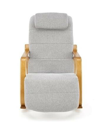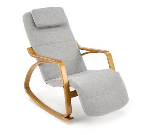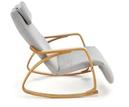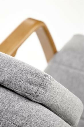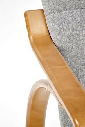 Křeslo Prime má rám z masivného dřeva, který vytváří dřevěné ližiny a dlouhé područky. Sedák z látky v šedém provedení je vybaven přídavnou poduškou na podpěru hlavy. Díky dřeveným ližinám se můžete na křeslu pohupovat. Maximální nosnost křesla 100 kg. Zboží dodáváme v demontu.