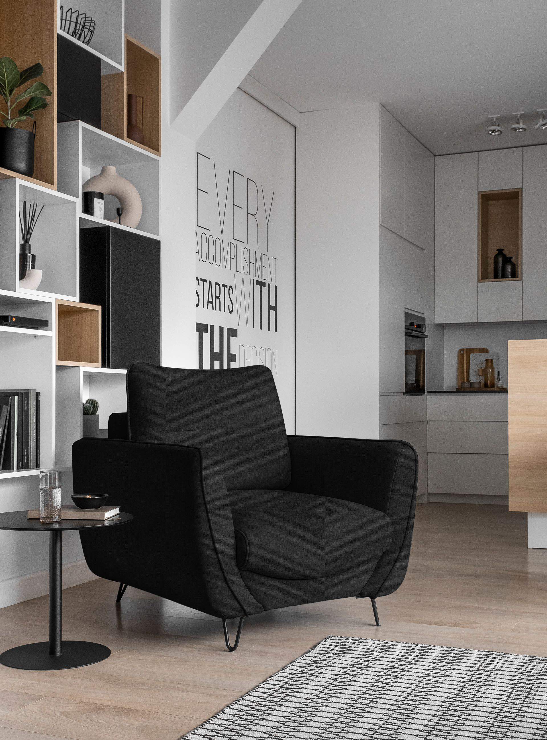 Křeslo Silva v dezénu Poco 10 má sedák vyplněn pěnou HR 3040 a vlnitými pružinami typu B. Opěradlo je vyplněno pěnovým granulátem. Nohy křesla jsou vyrobeny z oceli v černé barvě o výšce 13 cm.