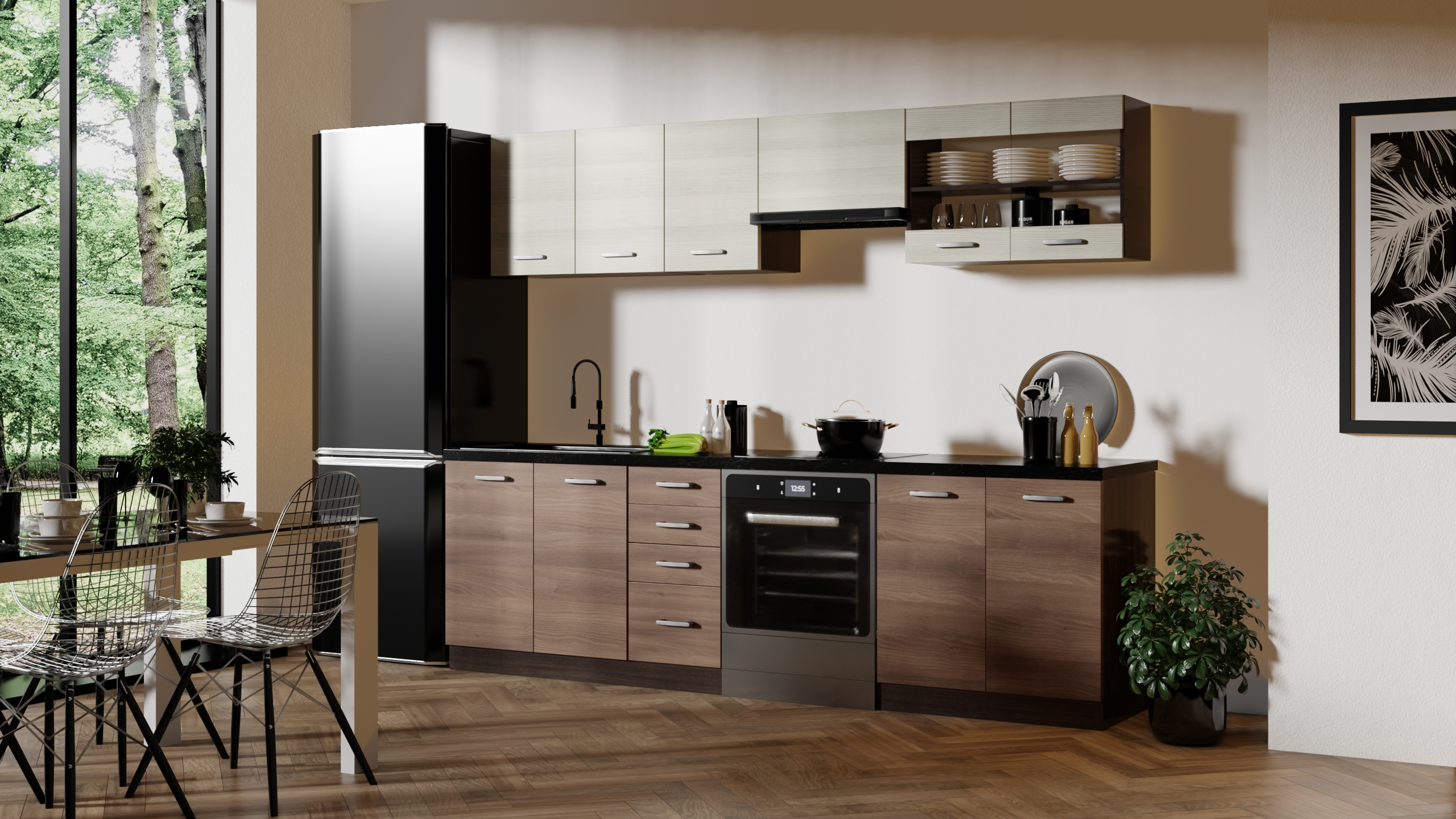 Długość zestawu: 260 cm, grubość blatu: 28 mm, podnośniki gazowe, kolory: front: akacja cynamonowa / dąb navara, korpus - wenge, blat - granit