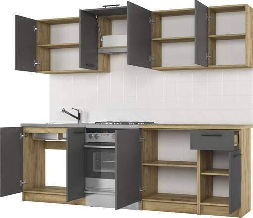 Kuchyňská linka Daria je vyrobena z kvalitního lamina. Korpus linky je v barvě dub craft, dvířka v barvě antracyt. V ceně linky je pracovní deska - antracit, tl.28 mm (mimo skříňky 80dřezové - celoplošný dřez). Tato kuchyňská linka obsahuje plynové písty. Kuchyňská linka je variabilní. Zboží dodáváme v demontu.