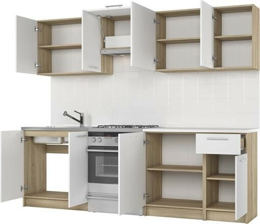 Kuchyňská linka Daria je vyrobena z kvalitního lamina. Korpus linky je v barvě dub sonoma, dvířka v barvě bílá mat. V ceně linky je pracovní deska - bílá, tl.28 mm (mimo skříňky 80dřezové - celoplošný dřez). Tato kuchyňská linka obsahuje plynové písty. Kuchyňská linka je variabilní. Zboží dodáváme v demontu.