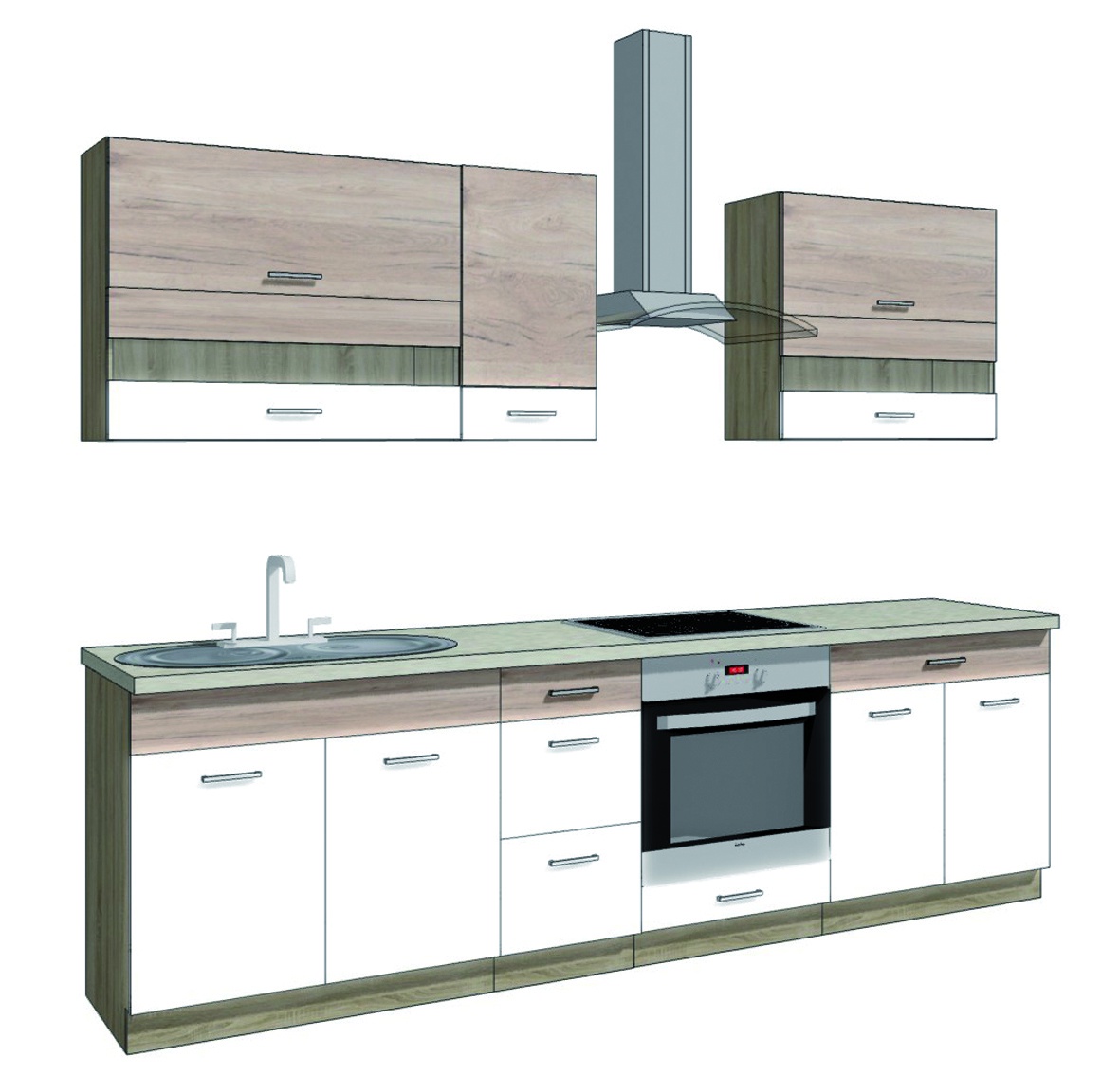Kuchyňská linka vč. pracovní desky je vyrobena z laminované dřevotřísky v barevném provedení: korpus dub sonoma, dvířka san remo/bílá PVC. Dovírání v zásuvkách i dveřích je s funkcí tichého dovírání. Dolní skříňky jsou bez pracovní desky a soklu. Zboží dodáváme v demontu.
