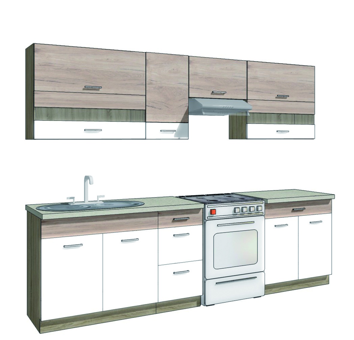 Kuchyňská linka vč. pracovní desky je vyrobena z laminované dřevotřísky v barevném provedení: korpus dub sonoma, dvířka san remo/bílá PVC. Dovírání v zásuvkách i dveřích je s funkcí tichého dovírání. Dolní skříňky jsou bez pracovní desky a soklu. Zboží dodáváme v demontu.