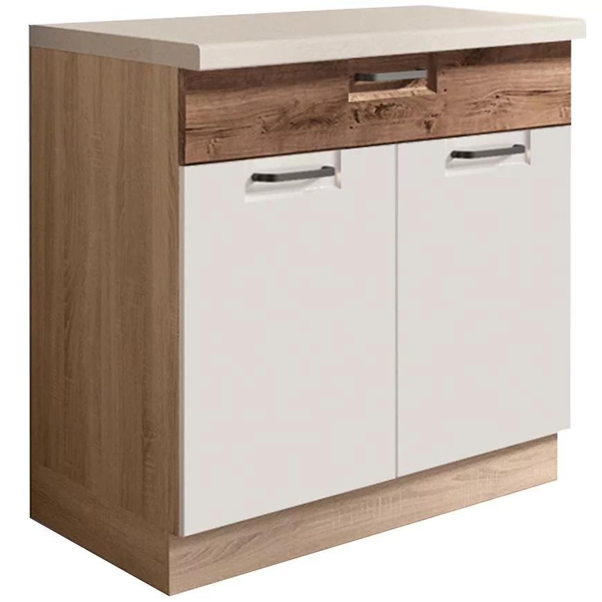 Kuchyňská linka bez pracovní desky je vyrobena z laminované dřevotřísky v barevném provedení korpus dub sonoma, dvířka bílá lesk/ribbeck. Dovírání v zásuvkách i dveřích je s funkcí tichého dovírání. Dolní skříňky jsou bez pracovní desky a soklu. Zboží dodáváme v demontu.