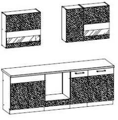 Kuchyňská linka (komplet) je vyrobena z kvalitní dřevotřísky (16 mm) v barvě korpusu - rijeka světlá. Cena této sestavy je včetně pracovní desky - dezén travertyn světlý ( 240 cm ). Dezén dvířek - bílá lesk/grafit mat, dvířka zdobí kovové úchytky. Zboží dodáváme v demontu.