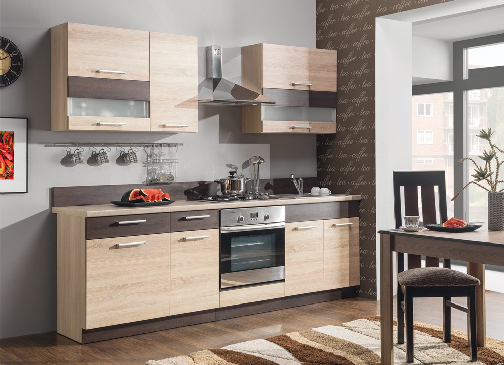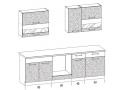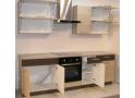 Kuchyňská linka (komplet) je vyrobena z kvalitní dřevotřísky (16 mm) v barvě korpusu - rijeka světlá. Cena této sestavy je včetně pracovní desky - dezén travertyn světlý ( 240 cm ). Dezén dvířek lze vybrat dle nabídky , dvířka zdobí kovové úchytky. Zboží dodáváme v demontu.
