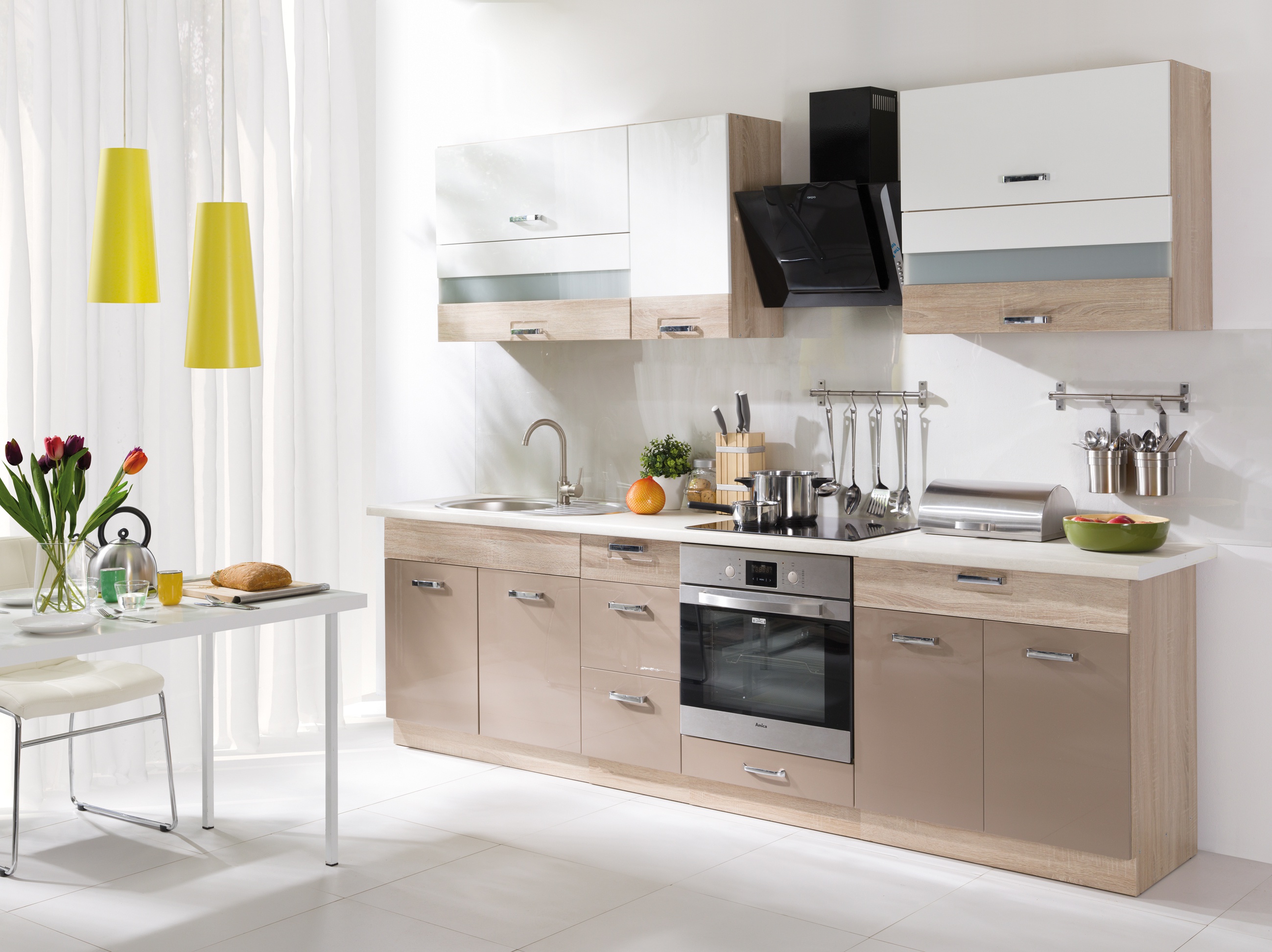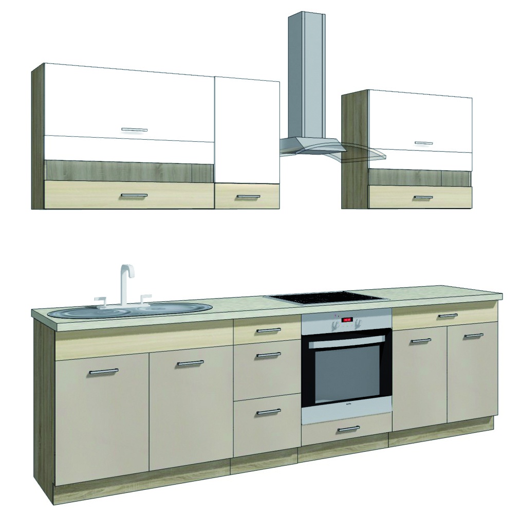 Kuchyňská linka vč. pracovní desky je vyrobena z laminované dřevotřísky v barevném provedení dub sonoma/bílá PVC/cappuccino lesk. Dovírání v zásuvkách i dveřích je s funkcí tichého dovírání. Dolní skříňky jsou bez pracovní desky a soklu. Zboží dodáváme v demontu.