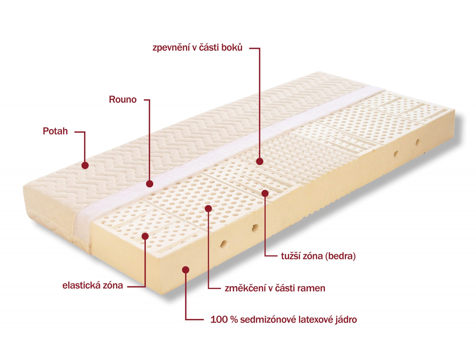 Luxusní 100% latexová matrace rozdělená vertikálními otvory do sedmi anatomických zón. Střední část matrace je pevnější, v oblasti ramen a kyčlí naopak měkčí. Vyšší objemová hmotnost jádra matraci řadí k tužším 100% latexovým matracím s označením tvrdosti číslo 2. Díky svým ortopedickým vlastnostem je vhodná pro všechny typy zákazníků, ocení ji hlavně starší populace. Latexová matrace zamezuje tlaku v oblasti kyčlí a kloubů, poskytuje dokonalé uvolnění krční páteře. Matraci je vhodné uložit na všechny typy lamelových roštů. Matrace lze vybrat v potahu ÚPLET nebo ALOE VERA. V objednávce prosím uveďte Vámi vybraný potah. Výška matrace včetně potahu 17 cm. Matrace do hmotnosti 120 kg.