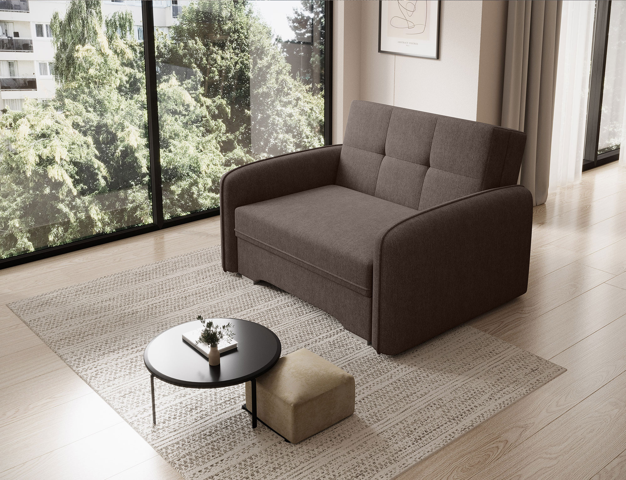 The Laine 1-seater sofa is a compact and functional piece of furniture, ideal for smaller spaces or as an additional seating and sleeping option. Its dimensions are 102x109x84 cm, making it a neat solution that doesn’t take up much space. The seat of the sofa is filled with T25 foam, which is characterized by medium firmness, making the sofa comfortable for both daily relaxation and occasional sleep. An additional advantage of the Laine sofa is the sleeping function. When unfolded, the piece of furniture transforms into a comfortable bed, making it an ideal solution for unexpected guests or limited space for a permanent bed. The design of the sofa is modern and stylish, allowing it to fit into various interior arrangements.