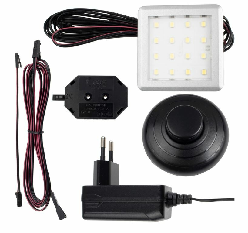 Sestava SQUARE umožňuje shora nasvítit teplou bíloui barvou vitríny. Sada obsahuje jeden světelný bod (1 lampu) připojený k 2metrovému kabelu s nožním spínačem.