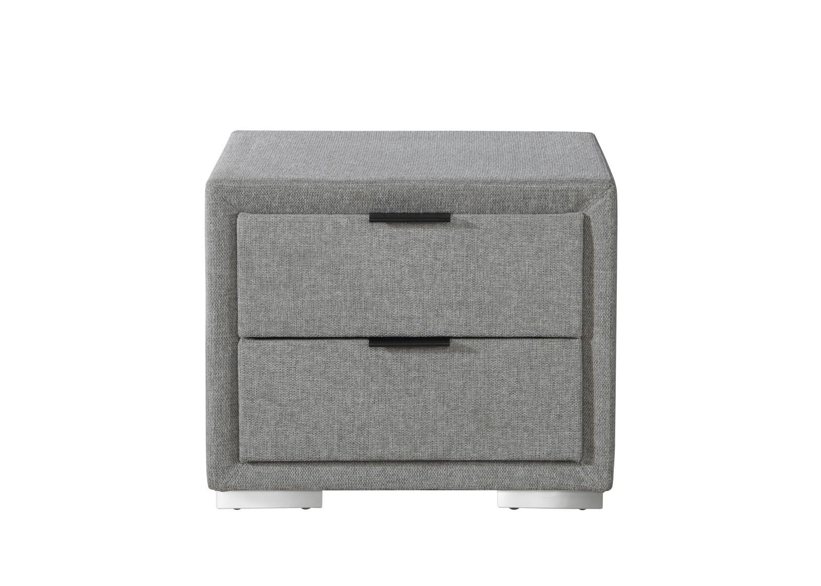 Stolek je čalouněný látkou v barevném provedení: šedá. Stojí na chromových nožičkách a nabízí úložný prostor v podobě dvou šuplíků.