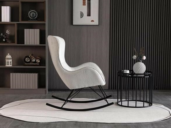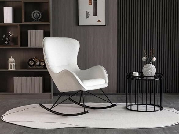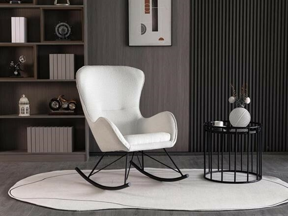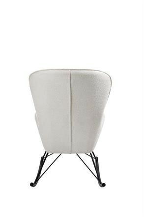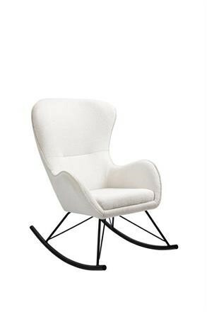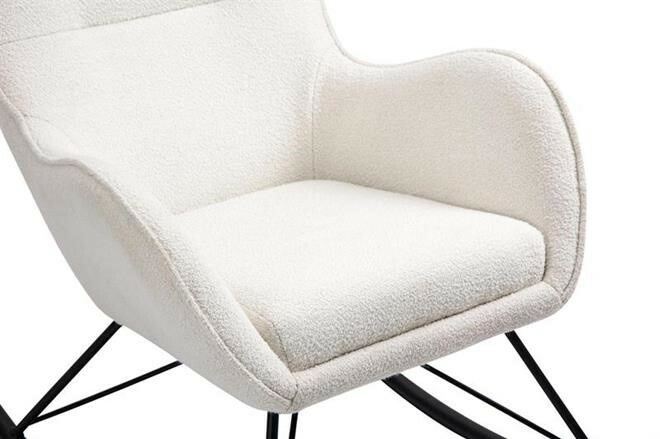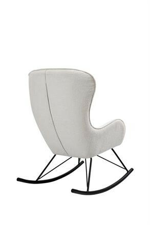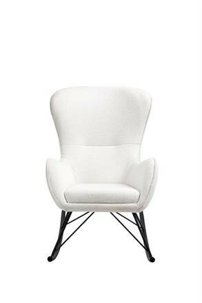 Houpací křeslo Liberto je nápadné především potahem z buklé tkaniny bílém provedení, kterou je potažené celé křeslo včetně područek. Tkanina připomíná ovčí srst a je příjemná na dotek. Nohy křesla jsou z chromované oceli ve černém provedení. Maximální nostnost 100 kg. Zboží dodáváme v demontu.