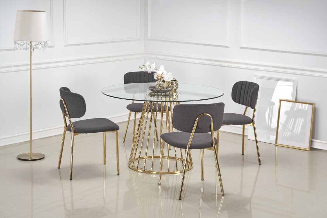 Kulatý jídelní stůl má desku vyrobenou z čirého skla, podstava je z chromované oceli ve zlaté barvě. Jídelní židle nejsou součástí produktu. Zboží je dodáváno v demontu.