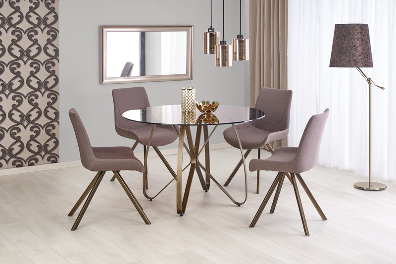 Kulatý jídelní stůl má desku vyrobenou ze skla v barevném provedení hnědá. Nohy jsou lakovaná ocel v barevném provedení starožitné zlato. Jídelní židle nejsou součástí produktu. Zboží dodáváme v demontu.