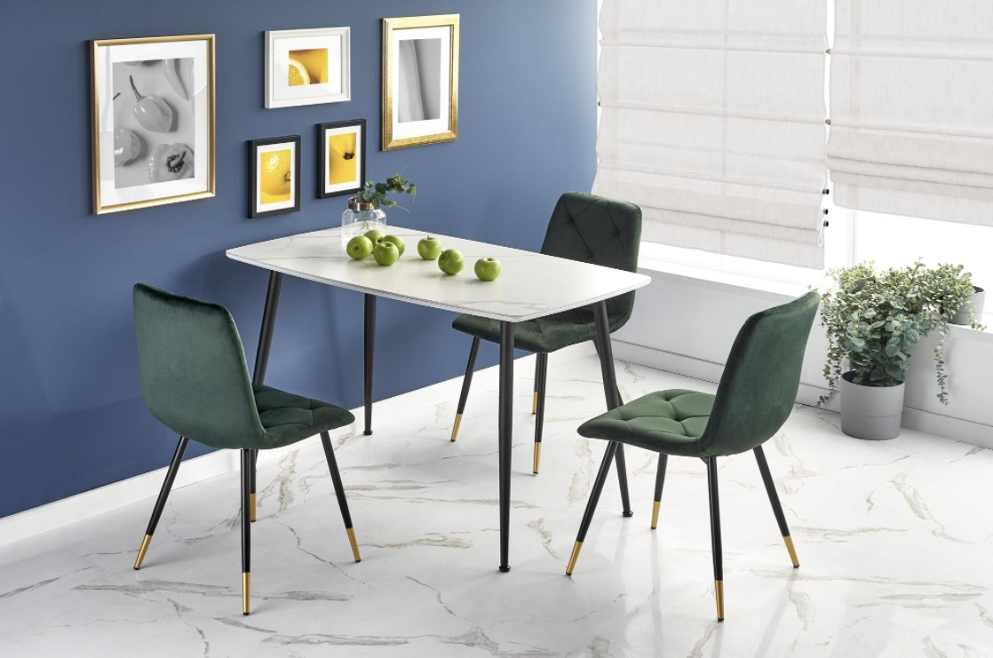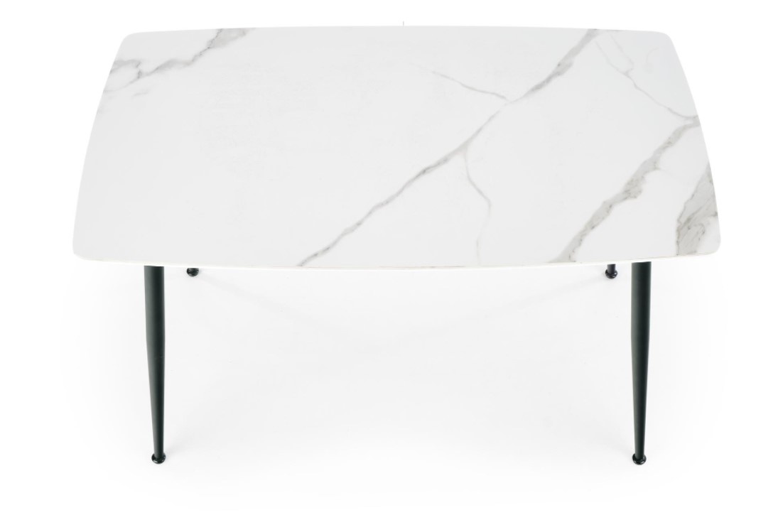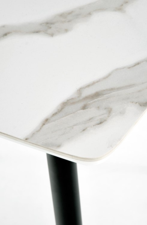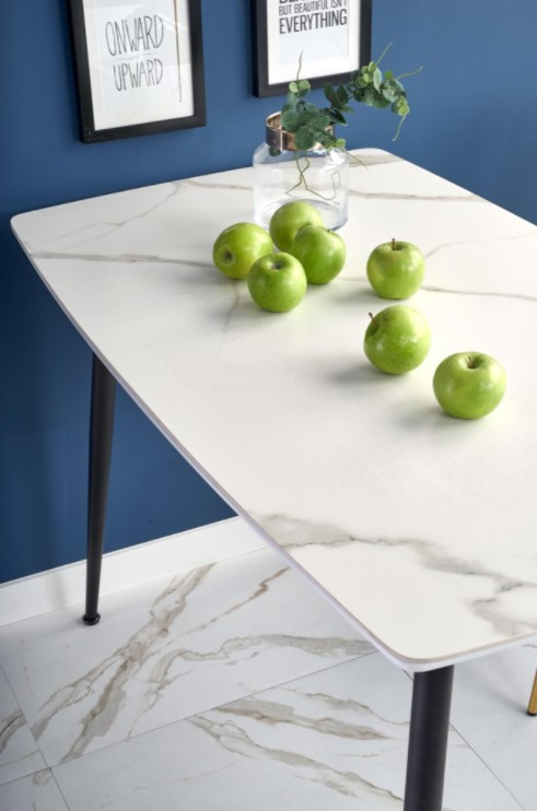 Jídelní stůl obdélníkový je vyroben v kombinaci materiálu sklo/MDF lakovaná/ocel malovaná práškovaná. Horní deska stolu je v barvě bílý mramor, nohy jsou v barvě černé. Zboží dodáváme v demontu. Foto je ilustrační, židle nejsou součástí produktu.