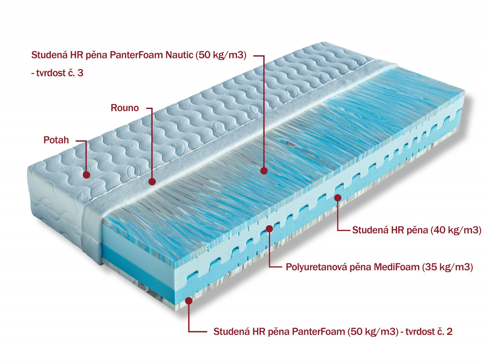 Luxusní matrace s volbou dvojí tvrdosti. Měkčí stranu tvoří kvalitní profilovaná studená HR pěna společně se speciální studenou pěnou PanterFoam (tvrdost č. 2). Druhou stranu matrace tvoří profilovaná tvrzená pěna MediFoam a speciální studená pěna PanterFoam Nautic (tvrdost č. 3). Tyto pěny jsou elastické, mají dlouhou životnost a jejich vlastnosti jsou stálé. Pěna PanterFoam Nautic má navíc antibakteriální úpravu, díky které je odolná proti bakteriím a roztočům. Dobrá ventilace zajistí pocit čistoty a svěžesti. Je vhodná na všechny typy roštů. Matrace lze vybrat v potahu SILVERGUARD,MEDICOTT,LYOCELL - antibakteriální potah nebo LEVANDULE - s relaxačními účinky. V objednávce prosím uveďte Vámi vybraný potah. Výška matrace včetně potahu 24 cm. Matrace do hmotnosti 130 kg.