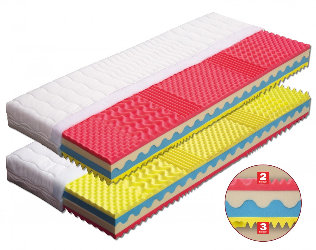 Tato matrace je vhodná pro páry s rozdílnými požadavky na tuhost lůžka. Jádro matrace je tvořeno kombinací dvou elastických pěn MediFoam odlišných tuhostí. Každá strana matrace je tvořena vrstvou odolných pěn Sanitized s rozdílnou tuhostí ložných ploch, tvarovaných do masážních nopů. Díky použitým materiálům Sanitized matrace eliminuje výskyt roztočů. Matraci lze uložit na všechny typy roštů. Matrace lze vybrat v potahu SILVERGUARD,MEDICOTT,LYOCELL - antibakteriální potah nebo LEVANDULE - s relaxačními účinky. V objednávce prosím uveďte Vámi vybraný potah. Výška matrace včetně potahu 19 cm. Matrace do hmotnosti 130 kg. K této matraci nabízíme jako dárek zdarma 1x polštář Lukáš.