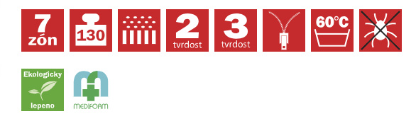7-zónová matrace s volbou dvojí tuhosti. Nosná vrstva označená tuhostí č. 2 je měkčí a poddajnější díky unikátnímu typu perforovaného Gel-Latexu. Jeho výborné anatomické vlastnosti ještě více zdůrazní středová tyrkysová pěna MediFoam (35 kg/m³). Otočením získáte tvrdší stranu (tuhost č. 3) tvořenou hráškově žíhanou pěnou MediFoam (38 kg/m³) se středem se speciálními zářezy ve tvaru „Y“ a jemným profilováním do vlnek. Matrace je vhodná na všechny typy roštů. Matrace lze vybrat v potahu SILVERGUARD,MEDICOTT,LYOCELL - antibakteriální potah nebo LEVANDULE - s relaxačními účinky. V objednávce prosím uveďte Vámi vybraný potah. Výška matrace včetně potahu 23 cm. Matrace do hmotnosti 130 kg.