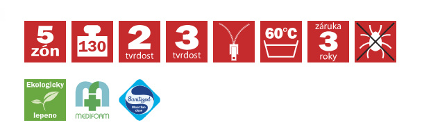 5--zónová matrace s volbou dvojí tuhosti. Jádro tvoří 12 cm vysoká vrstva speciální červené antibakteriální pěny (32 kg/m³) značky Sanitized. Je navržena se zářezy ve tvaru „Y“, které napomáhají odlehčení v místech největšího zatížení - oblast ramen. Vrchní stranu matrace změkčuje oblíbená viscoelastická pěna (50 kg/m³). Je charakteristická efektem pomalého vracení se do původní polohy. Pouhým přetočením matrace získáte pevnější stranu se vzdušnou a elastickou studenou HR pěnou (40 kg/m³), která má antidekubitní prořezy v pěti zónách. Je vhodná pro alergiky. Matrace je vhodná na všechny typy roštů, včetně motorových. Matrace lze vybrat v potahu SILVERGUARD,MEDICOTT,LYOCELL - antibakteriální potah nebo LEVANDULE - s relaxačními účinky. V objednávce prosím uveďte Vámi vybraný potah. Výška matrace včetně potahu 23 cm. Matrace do hmotnosti 130 kg.
