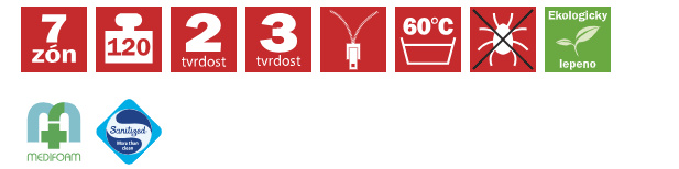 Jádra těchto matrací jsou tvořena hráškově žíhanou pěnou MediFoam (38 kg/m³).  Červená ložná plocha je tvořena antibakteriální pěnou tvarovanou do masážních nopů s úpravou Sanitized (32 kg/m³), tvrdost č. 3. Tyrkysově zelená pěna MediFoam (35 kg/m³) na druhé straně matrace je taktéž tvarovaná do nopů, tvrdost č. 2. Matrace lze vybrat v potahu ÚPLET nebo ALOE VERA. V objednávce prosím uveďte Vámi vybraný potah. Výška matrace včetně potahu 19 cm. Matrace do hmotnosti 120 kg.