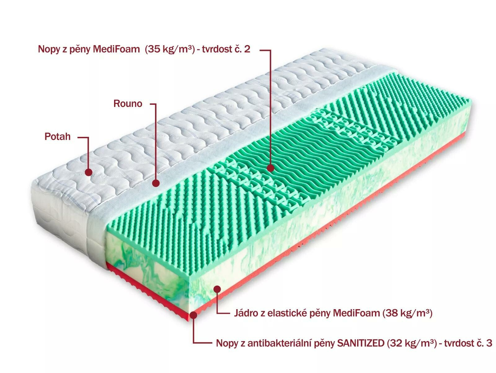 Jádra těchto matrací jsou tvořena hráškově žíhanou pěnou MediFoam (38 kg/m³). Červená ložná plocha je tvořena antibakteriální pěnou tvarovanou do masážních nopů s úpravou Sanitized (32 kg/m³), tvrdost č. 3. Tyrkysově zelená pěna MediFoam (35 kg/m³) na druhé straně matrace je taktéž tvarovaná do nopů, tvrdost č. 2. Matrace lze vybrat v potahu SILVERGUARD,MEDICOTT,LYOCELL - antibakteriální potah nebo LEVANDULE - s relaxačními účinky. V objednávce prosím uveďte Vámi vybraný potah. Výška matrace včetně potahu 19 cm. Matrace do hmotnosti 120 kg.