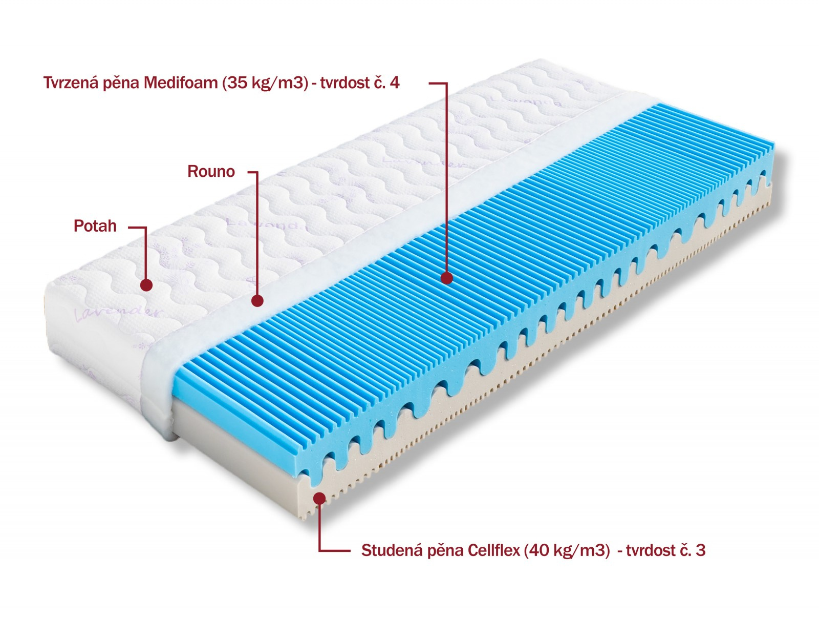 Pevná ortopedická matrace s volbou dvojí tvrdosti. Měkčí strana – to je luxusní studená pěna značky Cellflex. Díky vysoké hustotě (40 kg/m3) je velmi odolná a příjemná. Pevnější strana je tvořena tvrzenou pěnou MediFoam. Obě pěny jsou na povrchu příčně profilované do malinkých vlnek pro větší vzdušnost a lepší rozložení váhy těla. Lze vybrat v potahu ÚPLET/ALOE VERA. V objednávce prosím uveďte Vámi vybraný potah. Výška matrace včetně potahu 22 cm. Matrace do hmotnosti 140 kg.