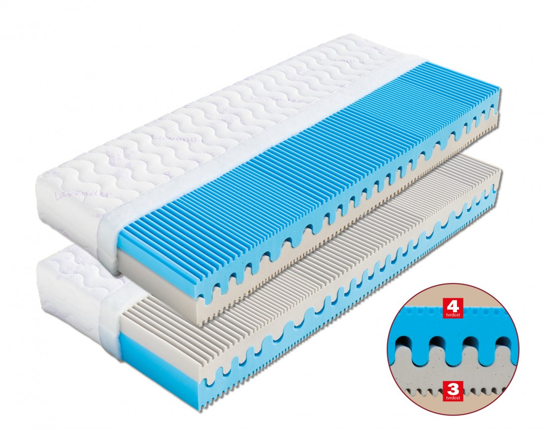 Pevná ortopedická matrace s volbou dvojí tvrdosti. Měkčí strana – to je luxusní studená pěna značky Cellflex. Díky vysoké hustotě (40 kg/m3) je velmi odolná a příjemná. Pevnější strana je tvořena tvrzenou pěnou MediFoam. Obě pěny jsou na povrchu příčně profilované do malinkých vlnek pro větší vzdušnost a lepší rozložení váhy těla. Matrace lze vybrat v potahu SILVERGUARD,MEDICOTT,LYOCELL - antibakteriální potah nebo LEVANDULE - s relaxačními účinky. V objednávce prosím uveďte Vámi vybraný potah. Výška matrace včetně potahu 22 cm. Matrace do hmotnosti 140 kg.