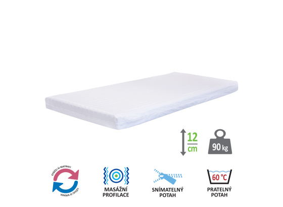 Oboustranná sendvičová matrace má jádro z polyuretanové pěny o výšce 11,5 cm. Povrch jádra je z jedné strany vyprofilován, z druhé strany hladký potah z bílého 100% polyesteru s příjemným hladkým povrchem. Potah je snímatelný a pratelný do 60 °C. Matrace je vhodná pro všechny typy roštů.