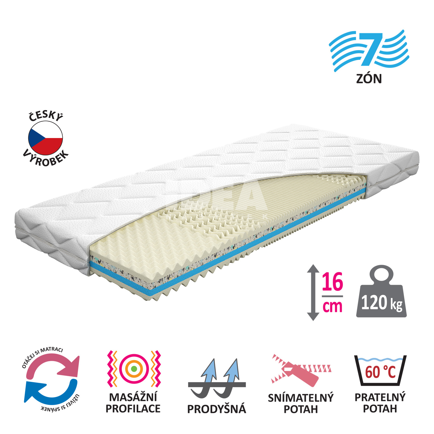 Oboustranná sendvičová matrace složená ze 4 vrstev ložné plochy z kvalitních polyuretanových pěn obě strany – 7zónová anatomická profilace, která zajišťuje provzdušnění lůžka. Jádro je tvořeno deskou z polyuretanu s vysokou nosností a tvrdčí deskou z pojeného polyuretanu RE. Matrace střední tuhosti (3 z 5). Potah snímatelný a pratelný do 60 °C. Doporučená nosnost do 120 kg. Výška matrace 16 cm, výška jádra 14 cm. Matrace je vhodná na pevný i polohovací lamelový rošt.
