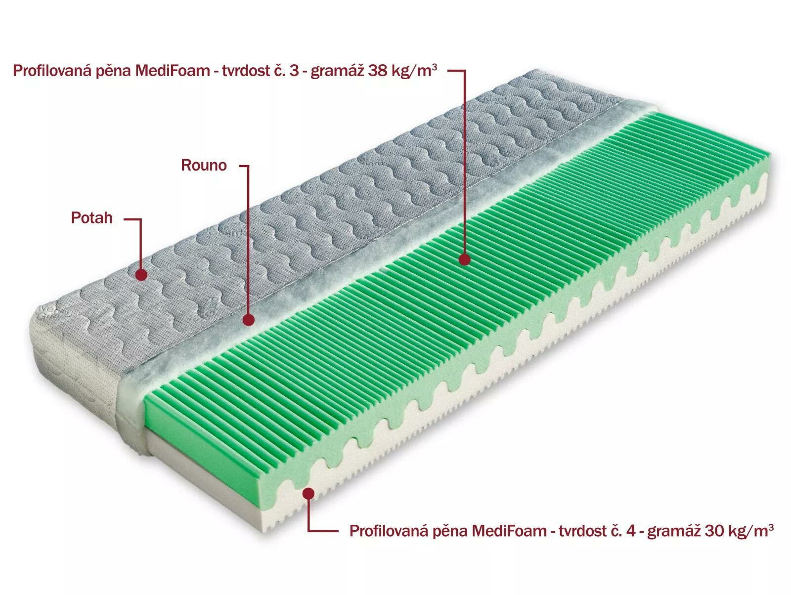 7-zónová matrace s volbou dvojí tuhosti. Jemná masážní profilace na povrchu těchto pěn přispívá k většímu provzdušnění matrace. Pěny jsou spojeny vlnkovitým profilem bez použití lepidla. Matrace je vhodná na všechny typy roštů. Matrace lze vybrat v potahu ÚPLET nebo ALOE VERA. V objednávce prosím uveďte Vámi vybraný potah. Výška matrace včetně potahu 18 cm. Matrace do hmotnosti 120 kg.