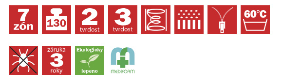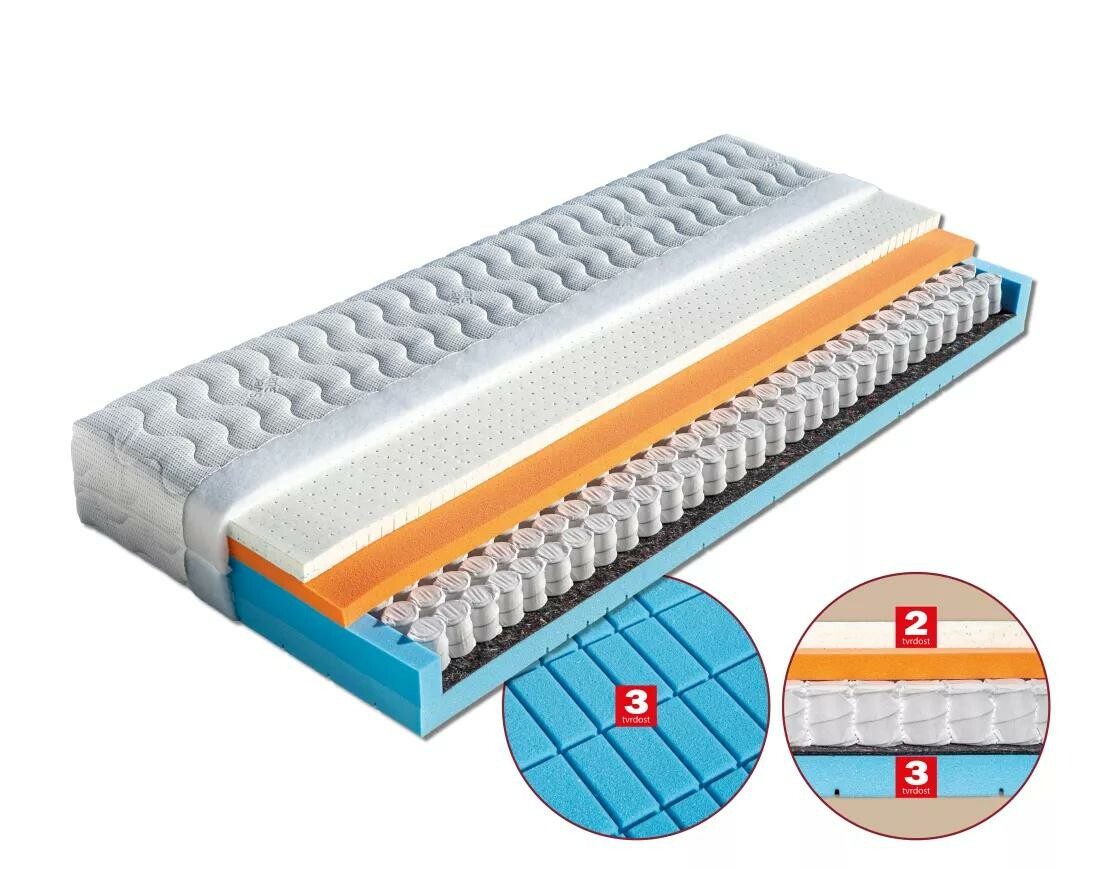 7-zónová matrace dvojí tvrdosti. Ortopedická matrace se systémem velkého počtu samostatně balených pružinek. Modrá vrchní vrstva HR pěny s gramáží 40 kg/m³ je opatřena antidekubitními zářezy, tvrdost č. 3. Protější strana s oranžovou HR pěnou je měkčí a poddajnější (tvrdost č. 2) a společně s 4 cm vrstvou Gel-Latexu dokonale kopíruje ležící tělo. Matrace může být položena na pevnou desku a na všechny typy roštů, kromě motorových. Matrace lze vybrat v potahu ÚPLET nebo ALOE VERA. V objednávce prosím uveďte Vámi vybraný potah. Celková výška matrace cca 23 cm. Nosnost matrace 130 kg.