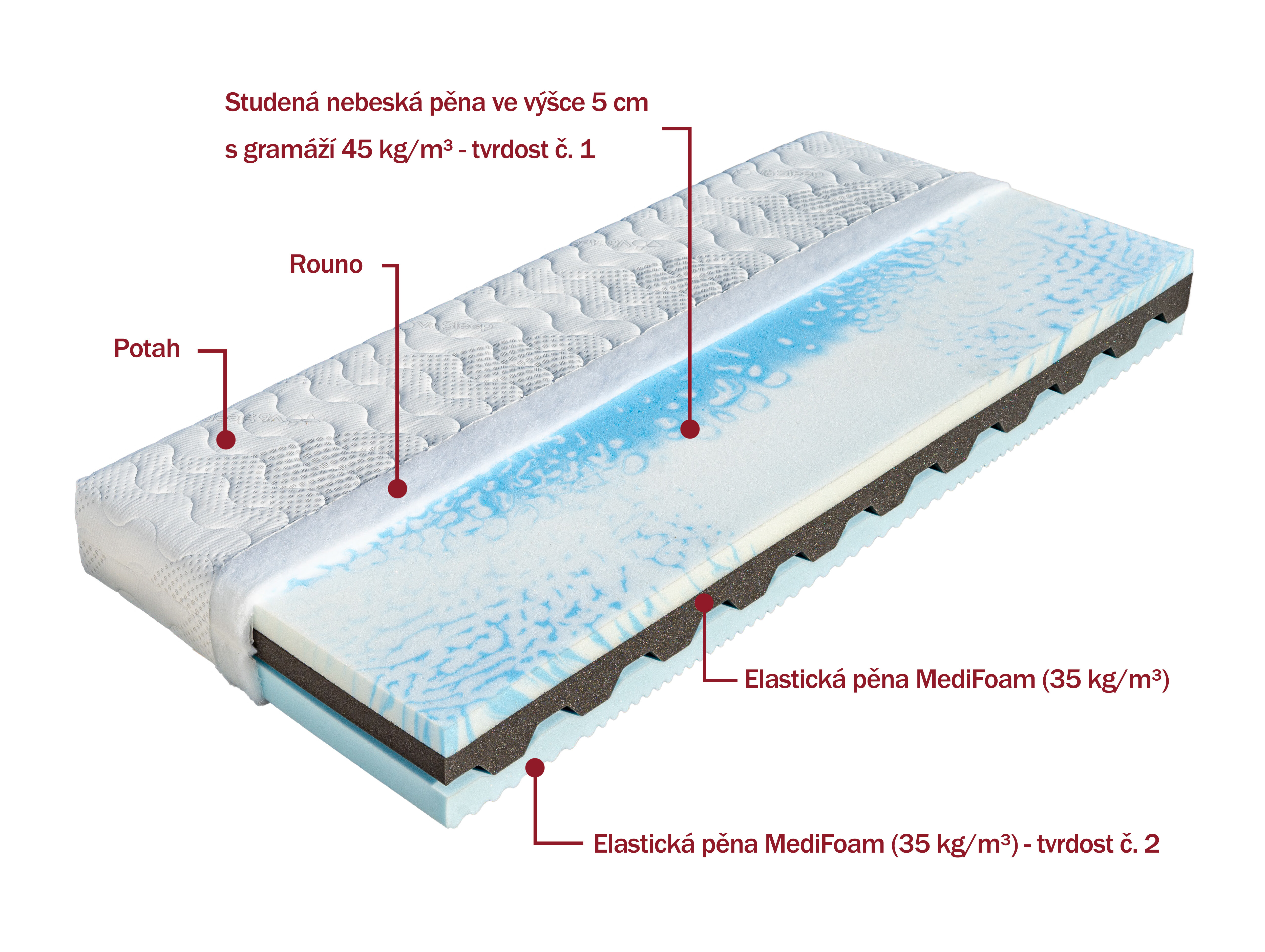 Matrace vyniká jedinečnými vlastnostmi velmi poddajné studené pěny ve výšce 5 cm s gramáží 45 kg/m³. Tato speciální nebeská pěna s příjemným povrchem je krásně měkká, velmi pohodlná a nevytváří protitlak vůči tělu. Střed jádra matrace je provzdušněn příčnými průduchy, které zaručují změkčení matrace v exponovaných místech. Je složen ze dvou pěn MediFoam (35 kg/m³). Matrace je vhodná pro všechny typy roštů. Matrace lze vybrat v potahu SILVERGUARD,MEDICOTT,LYOCELL - antibakteriální potah nebo LEVANDULE - s relaxačními účinky. V objednávce prosím uveďte Vámi vybraný potah. Výška matrace včetně potahu 20 cm. Matrace do hmotnosti 120 kg.