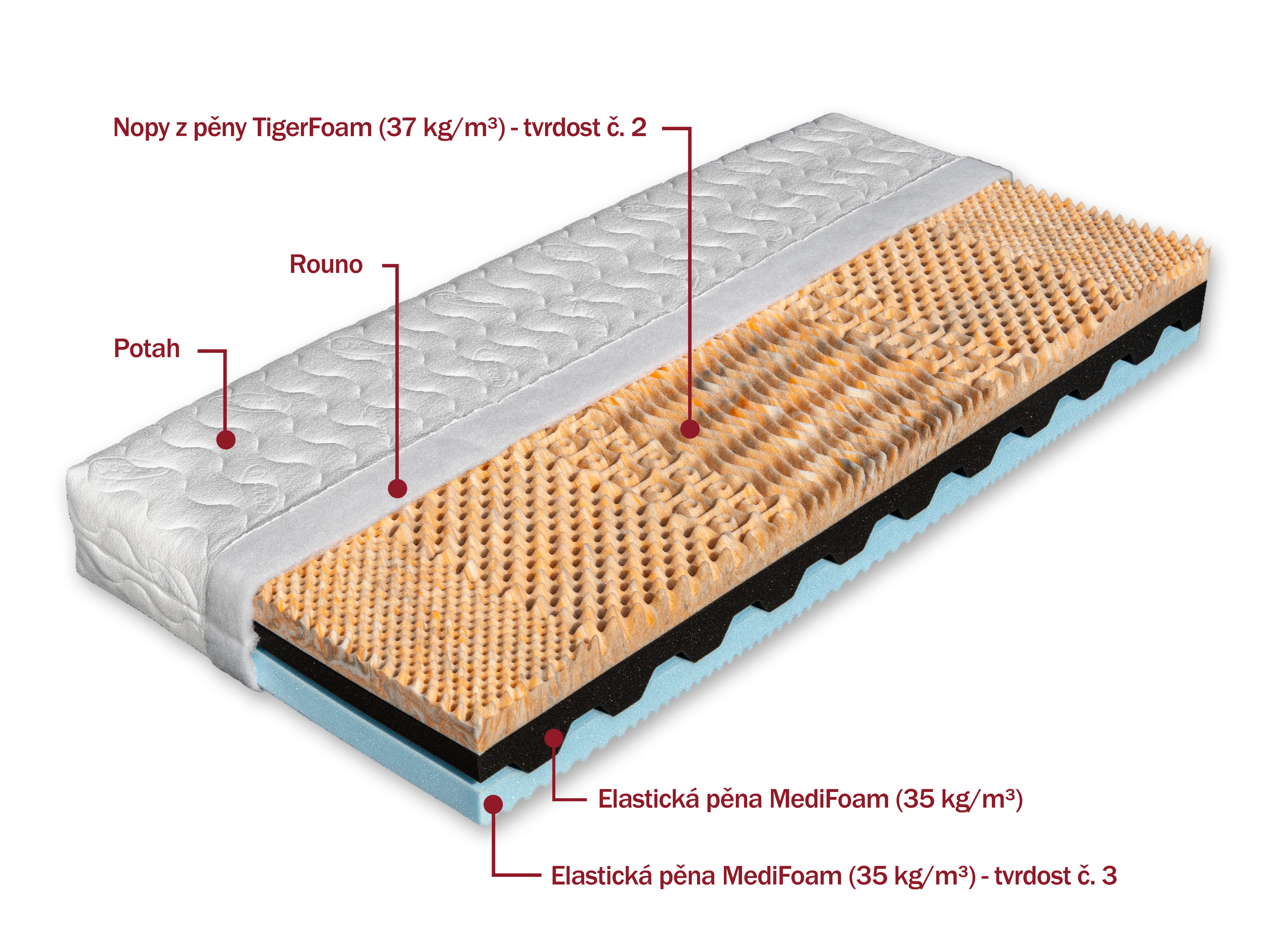 Luxusní matrace s volbou dvojí tvrdosti. Měkčí stranu tvoří komfortní studená pěna TigerFoam (37 kg/m³) tvarovaná do nopů v sedmi zónách. Střed jádra matrace je provzdušněn příčnými průduchy, které zaručují změkčení matrace v exponovaných místech. Je složeno ze dvou značkových pěn MediFoam (35 kg/m³) a jeho spodní část je profilována do jemných masážních vlnek. Tato ortopedická matrace je vhodná pro všechny typy roštů. Matrace lze vybrat v potahu SILVERGUARD,MEDICOTT,LYOCELL - antibakteriální potah nebo LEVANDULE - s relaxačními účinky. V objednávce prosím uveďte Vámi vybraný potah. Výška matrace včetně potahu 21 cm. Matrace do hmotnosti 120 kg.