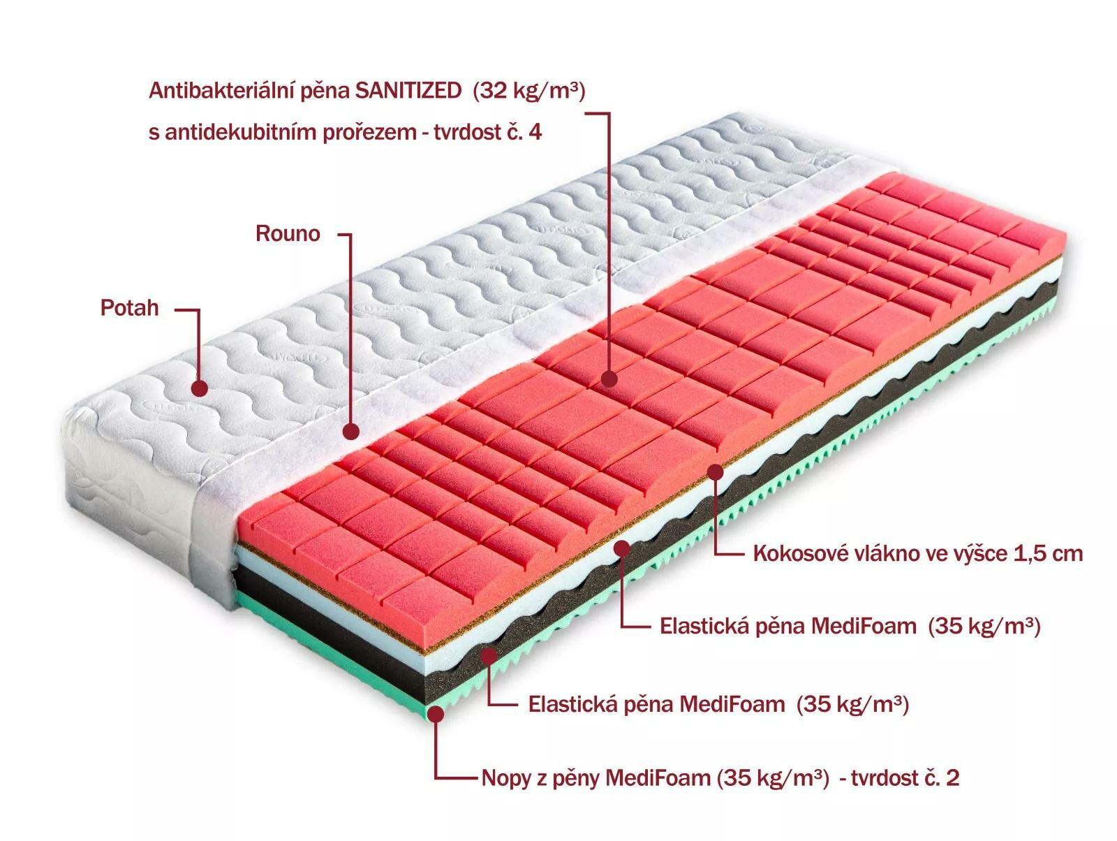 7--zónová ortopedická matrace vhodná také pro alergiky. Jádro matrace se skládá ze dvou odlišných pěn zasazených do sebe podélnou vlnou. Mezi pěnami je volná mezera. Černá pěna (35 kg/m³) je příjemně elastická, modrá tvrdší (35 kg/m³) s vyšším odporem proti stlačení. Ložnou plochu matrace tvoří antibakteriální pěna (32 kg/m³), která má antidekubitní prořez a tvrdost č. 4. Vrstva kokosového vlákna ve výšce 1,5 cm matraci provzdušňuje. Druhou stranu tvoří tyrkysově zelená masážní pěna MediFoam (35 kg/m³) ve tvaru nopů, tvrdost č. 2. Matrace lze vybrat v potahu SILVERGUARD,MEDICOTT,LYOCELL - antibakteriální potah nebo LEVANDULE - s relaxačními účinky. V objednávce prosím uveďte Vámi vybraný potah. Výška matrace včetně potahu 22 cm. Matrace do hmotnosti 130 kg.