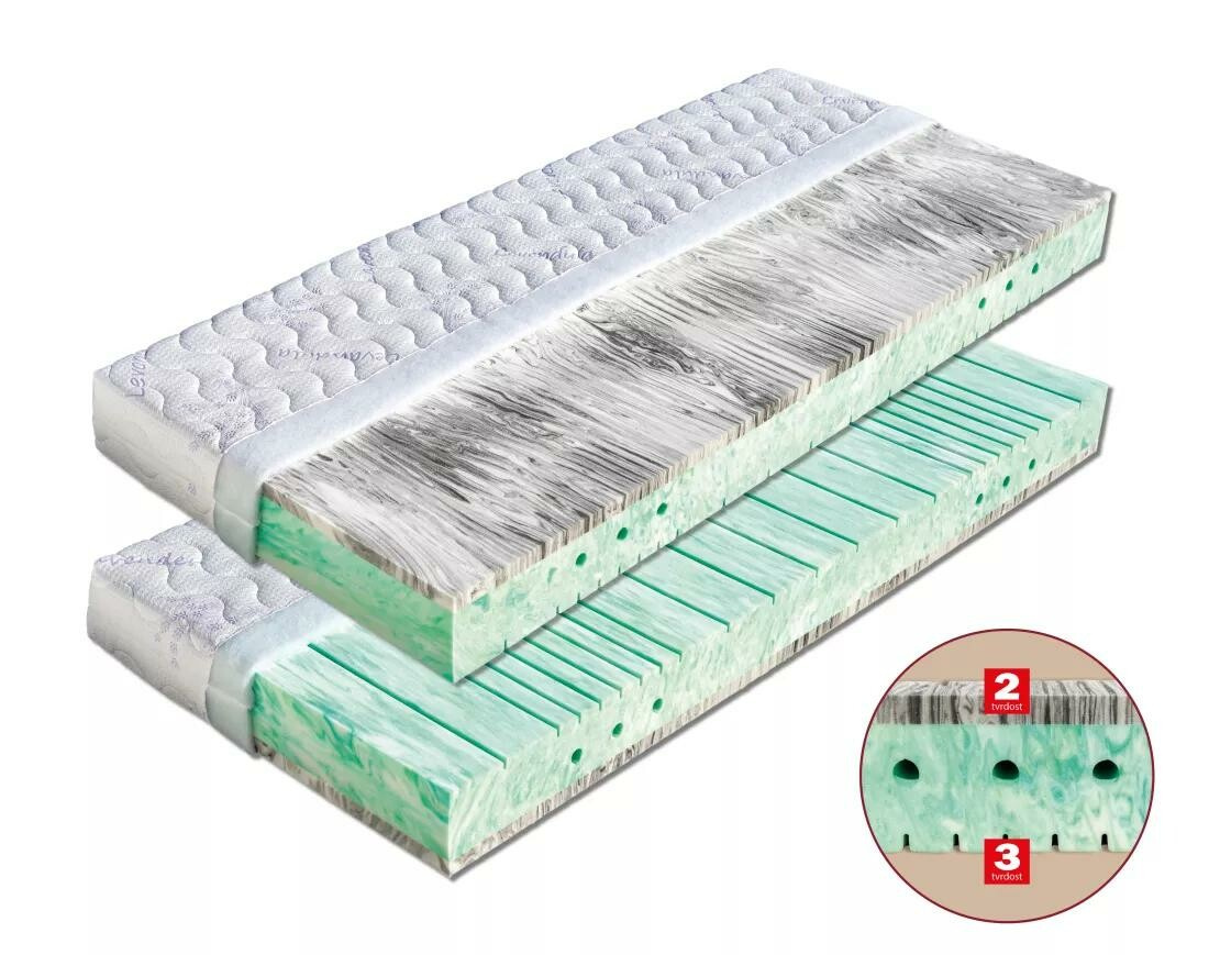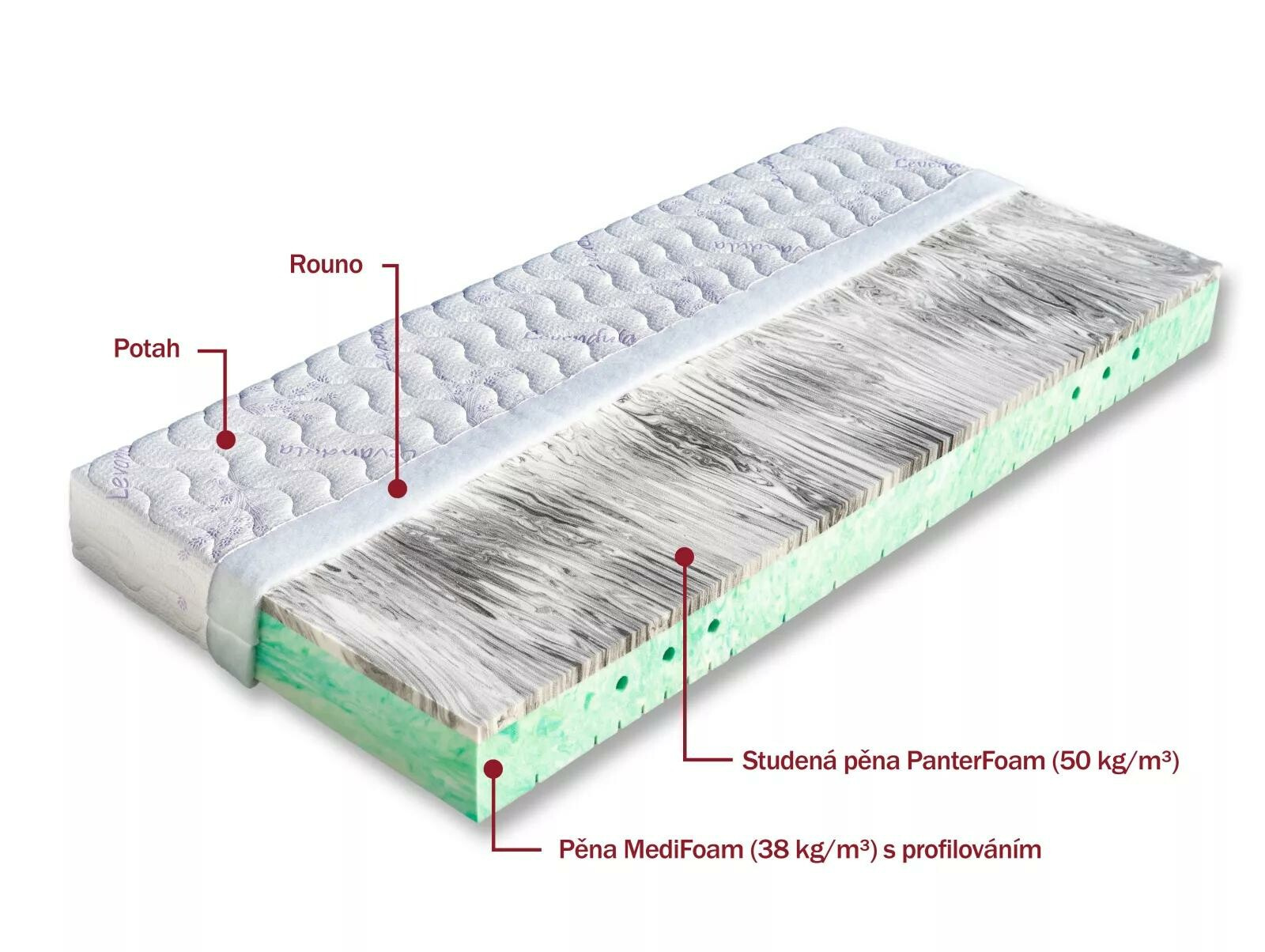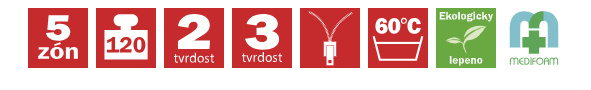 5--zónová matrace s volbou dvojí tuhosti. Vrchní strana je tvořena oblíbenou studenou pěnou PanterFoam (50 kg/m³). Jádro matrace tvoří hráškově žíhaná pěna MediFoam (38 kg/m³), která je opatřena otvory. Matrace je vhodná na všechny typy roštů. Matrace lze vybrat v potahu SILVERGUARD,MEDICOTT,LYOCELL - antibakteriální potah nebo LEVANDULE - s relaxačními účinky. Celková výška matrace cca 17 cm. Nosnost matrace 120 kg.