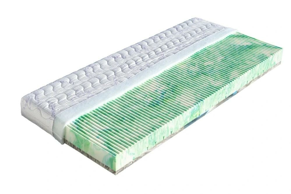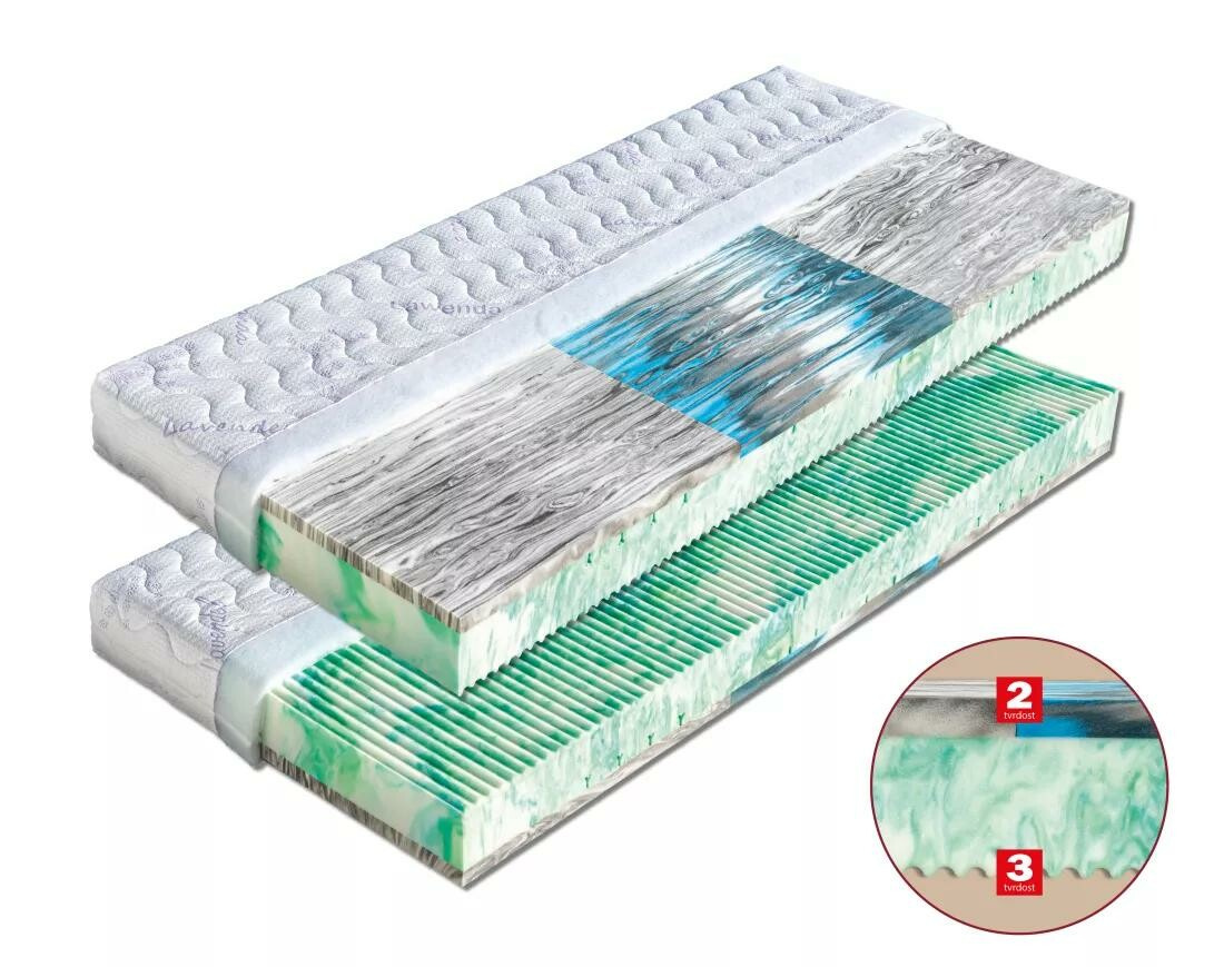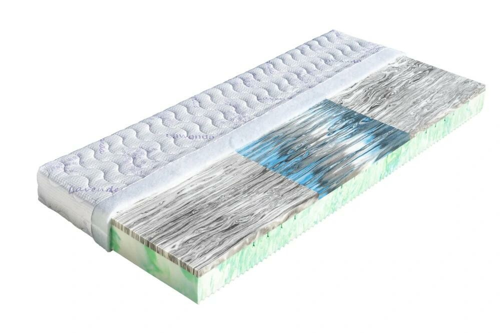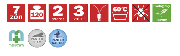 7--zónová matrace s volbou dvojí tuhosti. Vrchní strana je tvořena prodyšnou studenou pěnou PanterFoam (50 kg/m³) s otevřenými buňkami. Její středová část je vylepšená antibakteriální pěnou PanterFoam Nautic (50 kg/m³), která je odolná vůči bakteriím a roztočům. Střed matrace tvoří hráškově žíhaná pěna MediFoam (38 kg/m³). Matrace lze vybrat v potahu SILVERGUARD,MEDICOTT,LYOCELL - antibakteriální potah nebo LEVANDULE - s relaxačními účinky. V objednávce prosím uveďte Vámi vybraný potah. Celková výška matrace cca 16 cm. Nosnost matrace 120 kg.