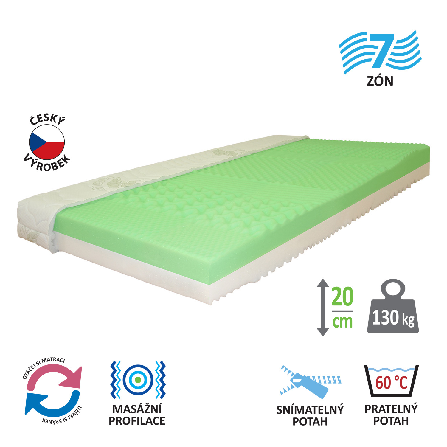 Masážní profily s různou pevností stran, jádro z Flexifoam pěny, povrch je vyprofilován do 7 anatomických zón na obou stranách tvrdá (bílá) a měkká (světle zelená) strana vhodná pro všechny typy roštů, vhodná pro alergiky, potah pratelný do 60 °C, doporučená nosnost do 130 kg.