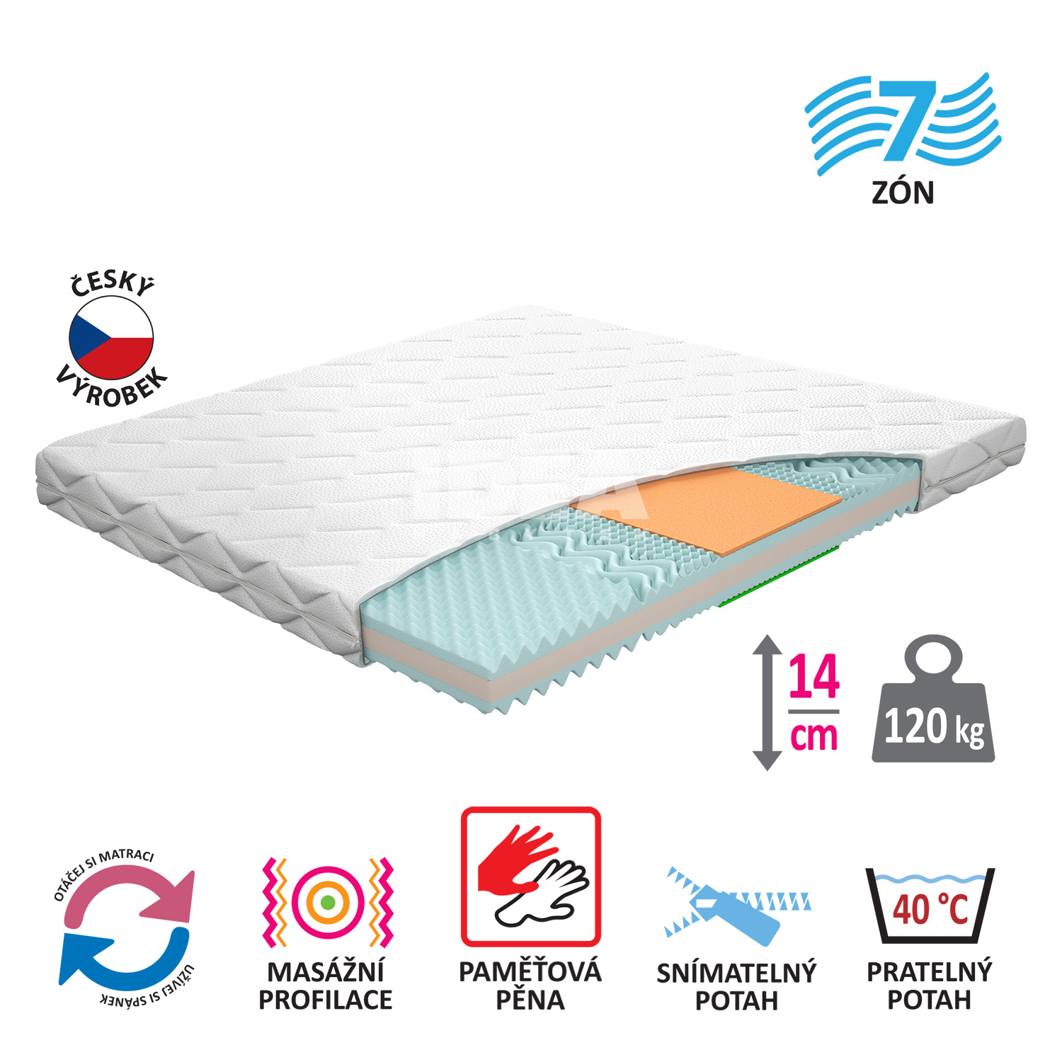 Paměťová pěna různých tuhostí v pánevních zónách přináší odlehčení kloubům a celému pohybovému aparátu, 7zónová anatomická masážní profilace – velice jemná masáž v průběhu spánku, matrace s Visco systémem rozdílné tuhosti stran vhodná pro všechny typy roštů, potah snímatelný a pratelný do 40 °C, doporučená nostnost do120 kg.